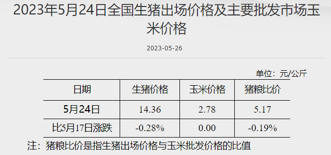发改委:猪粮比价为5.17 较5月17日下跌0.19% 发改委网站 05月29日 据国家发改委数据,截至5月24日,全国生猪出场价格为14.36元/公斤,较5月17日下跌0.28%;主要批发市场玉米价格为2.78元/公斤,较5月17日持平;猪粮比价为5.17,较5月17日下跌0.19%。(文章来源:发改委网站) (责任编辑:admin)