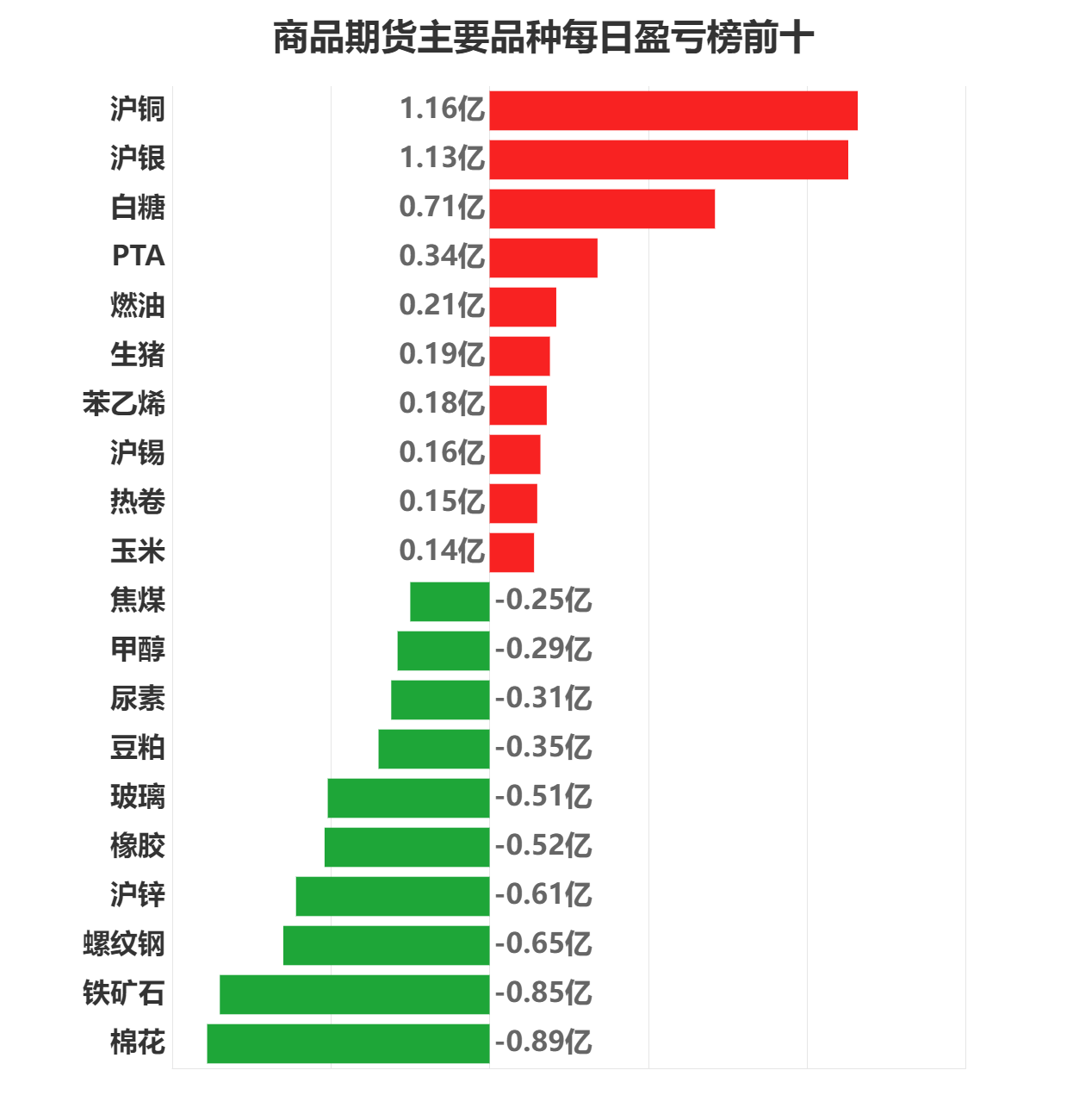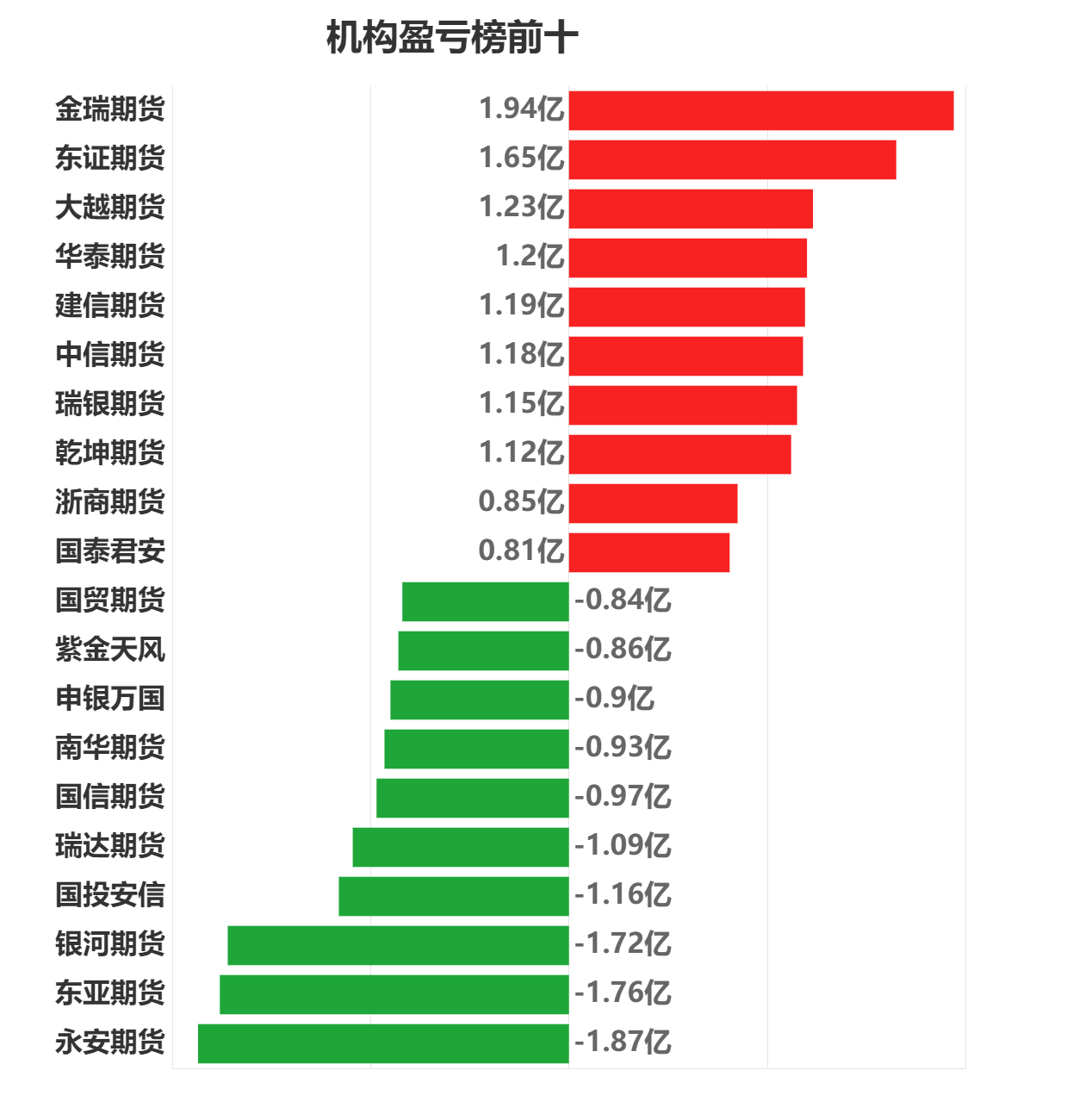 每日市场龙虎榜,带你深度了解市场。 市场一览:周一商品期货综合指数上涨1.14%,日内资金净流出5.28亿元。 市场成交量为3729.31万手,成交额为1.93万亿元。 持仓量为4027.75万手,较前一交易日减少25.21万手。 市场成交量前十和持仓量前十如下图所示: ![]() ![]() ![]() 品种盈亏榜:今日商品期货中沪铜盈利第一,为1.16亿元。 棉花亏损第一,为0.89亿元。 ![]() 就沪铜而言,今日席位盈利前三为金瑞期货、建信期货、弘业期货,分别盈利14190.42万元、7836.89万元、5499.49万元。 今日席位亏损前三为永安期货、五矿期货、国投安信,分别亏损8835.80万元、5050.94万元、3286.96万元。 ![]() 就棉花而言,今日席位盈利前三为海通期货、长江期货、西部期货,分别盈利1352.15万元、1305.53万元、1218.90万元。 今日席位亏损前三为南华期货、海证期货、国信期货,分别亏损2750.59万元、2589.42万元、2486.75万元。 ![]() 席位盈亏榜:今日机构席位中金瑞期货盈利第一,为1.94亿元。 永安期货亏损第一,为1.87亿元。 ![]() 就金瑞期货而言,今日品种盈利前三为沪铜、纯碱、沪锡,分别盈利14190.42万元、1127.48万元、870.03万元。 今日品种亏损前三为沪铅、中证1000股指、玻璃,分别亏损29.87万元、28.68万元、23.60万元。 ![]() 就永安期货而言,今日品种盈利前三为纯碱、玉米、塑料,分别盈利4330.92万元、2452.73万元、1675.63万元。 今日品种亏损前三为沪铜、十债、螺纹钢,分别亏损8835.80万元、5583.62万元、3151.88万元。 ![]() (文章来源:东方财富研究中心) (责任编辑:admin) |