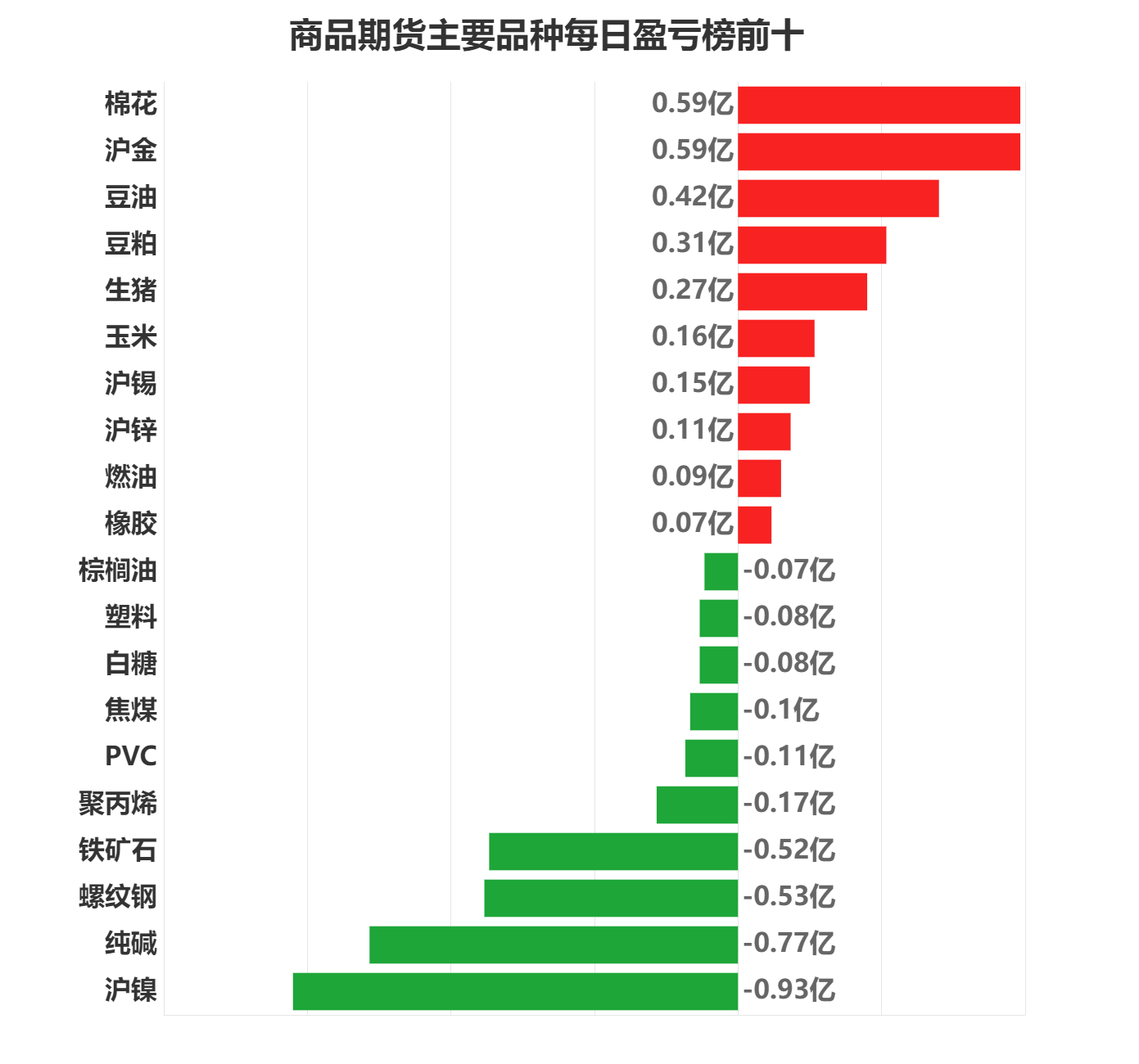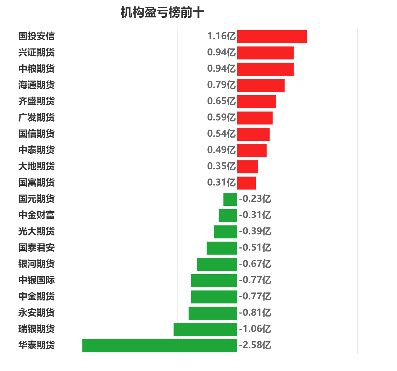 每日期货龙虎榜,带你深度了解市场。 市场一览:周二商品期货综合指数下跌0.63%,日内资金净流出38.52亿元。 市场成交量为3406.25万手,成交额为1.75万亿元。 持仓量为4032.31万手,较前一交易日增加4.56万手。 市场成交量前十和持仓量前十如下图所示: ![]() ![]() ![]() 品种盈亏榜:今日商品期货中沪金盈利第一,为0.59亿元。 沪镍亏损第一,为0.93亿元。 ![]() 就沪金而言,今日席位盈利前三为齐盛期货、中辉期货、中信期货,分别盈利6208.52万元、830.30万元、379.82万元。 今日席位亏损前三为中财期货、海通期货、中银国际,分别亏损526.32万元、367.89万元、281.39万元。 ![]() 就沪镍而言,今日席位盈利前三为中粮期货、国泰君安、五矿期货,分别盈利2014.47万元、1378.31万元、1048.39万元。 今日席位亏损前三为永安期货、中信建投、广州期货,分别亏损2798.06万元、1979.66万元、1679.01万元。 ![]() 席位盈亏榜:今日机构席位中国投安信盈利第一,为1.16亿元。 华泰期货亏损第一,为2.58亿元。 ![]() 就国投安信而言,今日品种盈利前三为中证500股指、豆油、豆粕,分别盈利10614.71万元、3384.75万元、1289.68万元。 今日品种亏损前三为五债、棕榈油、沪锡,分别亏损4425.16万元、1471.92万元、492.71万元。 ![]() 就华泰期货而言,今日品种盈利前三为生猪、铁矿石、沪镍,分别盈利630.63万元、607.78万元、544.91万元。 今日品种亏损前三为中证500股指、沪深、豆油,分别亏损15756.83万元、3615.49万元、3011.47万元。 ![]() (文章来源:东方财富研究中心) (责任编辑:admin) |