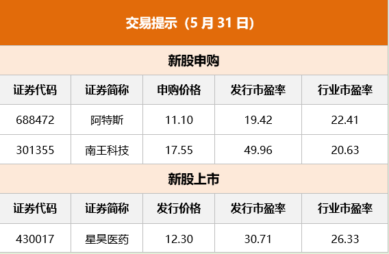 万华化学:自2023年6月份开始,公司中国地区聚合MDI挂牌价18800元/吨(同5月份相比没有变动);纯MDI挂牌价23300元/吨(比5月份价格上调500元/吨)。 贵州茅台:5月29日,在茅台冰淇淋上市一周年之际,西宁、拉萨、乌鲁木齐、兰州、银川、海口、呼和浩特等7家茅台冰淇淋旗舰店同步开业。至此,茅台冰淇淋已经完成全国内陆31个省区市共计34家旗舰店布局。 航天长峰:脑机接口具有广阔的应用前景,国内外已取得一定进展。航天长峰作为脑机接口联盟的首批理事单位,将与其他成员单位协同,积极参与相关技术的研发应用,促进技术创新融合。目前尚未拥有相关产品。 华能水电:公司拟在西藏地区投资建设水电站项目,项目装机容量260万千瓦,多年平均发电量112.81亿千瓦时,工程总工期132个月(不含筹建期),按2022年三季度价格水平计算,工程总投资583.81亿元。该项目投资是公司建设澜沧江西藏段清洁能源基地的重要枢纽。 东方盛虹:披露公司部分董事、监事、高级管理人员增持股份计划的进展:截至5月30日,增持主体以集中竞价交易方式累计增持4009.83万元公司股份,持股比例达0.054%。 科陆电子:公司取得中国结算深圳分公司出具的确认书,其已受理公司向美的集团发行2.52亿股股票的新股登记申请材料,相关股份登记到账后将正式列入公司的股东名册。此次发行完成后,公司新增股份2.52亿股,将于6月2日在深交所主板上市。此次权益变动完成后,美的集团持有公司22.79%的股份,成为公司控股股东,何享健成为公司实控人。 璞泰来:控股子公司嘉拓智能拟实施增资扩股。公司董事会经审议同意比亚迪股份有限公司、宁德新能源科技有限公司等21家投资人参与此次增资扩股事项。嘉拓智能本轮融资的整体投前估值40亿元,此次增资各方以合计不超过5.74亿元的投资价款认购嘉拓智能不超过4380万股,合计持有嘉拓智能不超过12.39%的股权。 保隆科技:近期,保隆科技收到全球高端品牌车企的《定点通知书》,获得其全球1个空气悬架系统储气罐项目定点。根据该主机厂规划,项目生命周期为8年,生命周期总金额约为人民币1.3亿元,预计2025年6月开始量产。 金百泽:公司暂未涉及CPO(共封装光学)产品;且公司未向英伟达公司供货,不存在相关收入;仅部分研发的产品方案需要,有采购英伟达的相关产品,采购金额较小。英伟达公司的业绩情况,对公司的业绩并无直接影响。前述概念与公司无直接相关性。 家乐福:据悉,将在非强制离职的基础上,在法国总部裁员近1000人,计划未来几天内开始与员工代表谈判。去年11月曾宣布一项规模40亿欧元的成本节约计划,涉及在“成本过高的欧洲办事处”裁员。 理想汽车:无论是订单量还是交付量,连续三周1000辆/天已经站稳。接下来主要任务是提升供应链的供应量,因为年初的供应目标设定的有点低了。