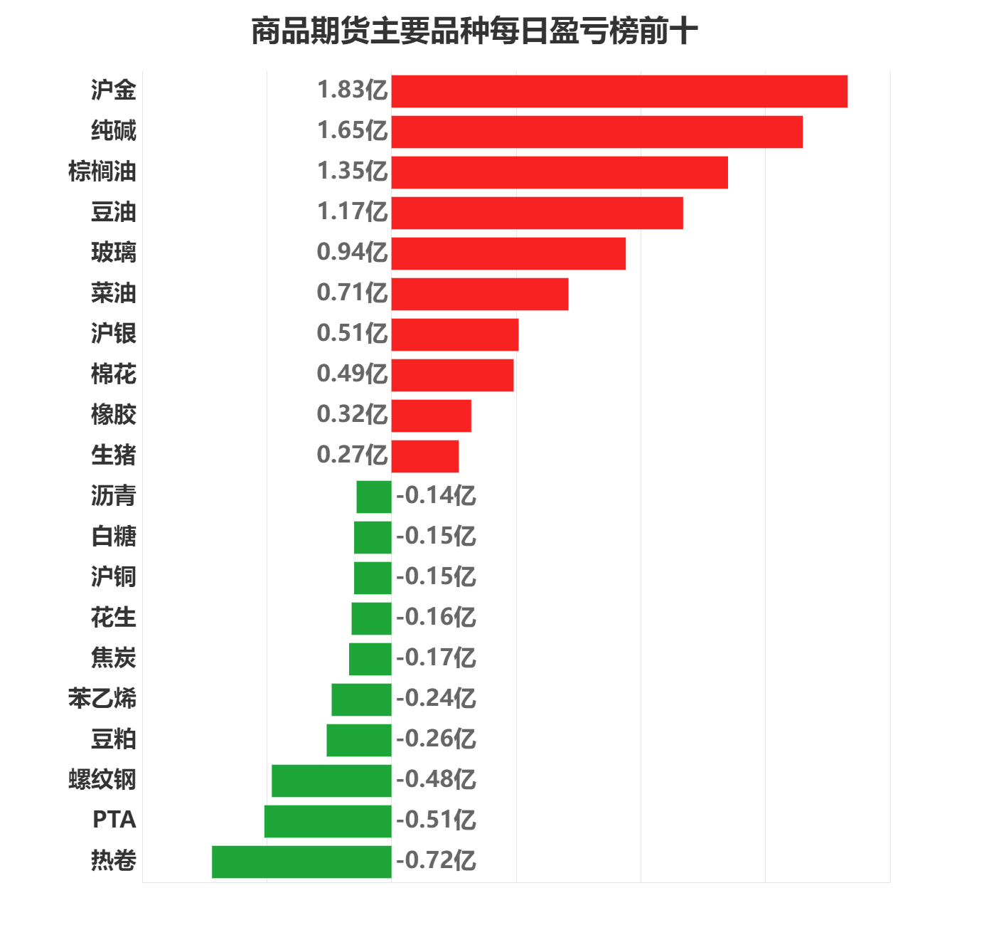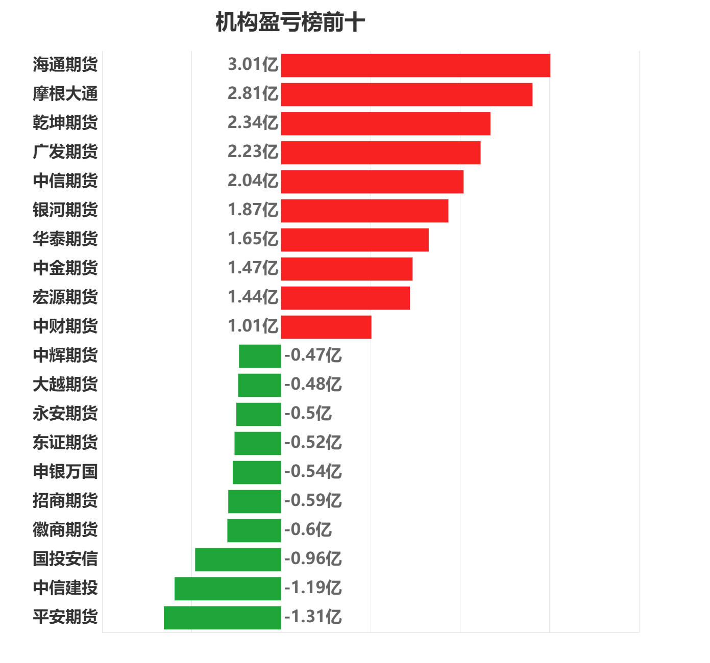 每日期货龙虎榜,带你深度了解市场。 市场一览:周三商品期货综合指数下跌0.5%,日内资金净流出11.32亿元。 市场成交量为3580.26万手,成交额为1.91万亿元。 持仓量为4025.12万手,较前一交易日减少7.19万手。 市场成交量前十和持仓量前十如下图所示: ![]() ![]() ![]() 品种盈亏榜:今日商品期货中沪金盈利第一,为1.83亿元。 热卷亏损第一,为0.72亿元。 ![]() 就沪金而言,今日席位盈利前三为中财期货、海通期货、华泰期货,分别盈利12116.71万元、4664.05万元、4229.65万元。 今日席位亏损前三为齐盛期货、兴证期货、福能期货,分别亏损5168.35万元、2658.37万元、1592.13万元。 ![]() 就热卷而言,今日席位盈利前三为申银万国、永安期货、东亚期货,分别盈利1370.02万元、1175.01万元、853.13万元。 今日席位亏损前三为海证期货、国泰君安、东证期货,分别亏损3491.52万元、3022.05万元、1325.56万元。 ![]() 席位盈亏榜:今日机构席位中海通期货盈利第一,为3.01亿元。 平安期货亏损第一,为1.31亿元。 ![]() 就海通期货而言,今日品种盈利前三为上证、铁矿石、沪金,分别盈利8827.45万元、6117.62万元、4664.05万元。 今日品种亏损前三为沪铜、沪深、焦煤,分别亏损1931.92万元、1532.31万元、1252.29万元。 ![]() 就平安期货而言,今日品种盈利前三为沪金、中证500股指、十债,分别盈利701.63万元、592.43万元、390.67万元。 今日品种亏损前三为上证、纯碱、甲醇,分别亏损4150.89万元、2873.67万元、2097.93万元。 ![]() (文章来源:东方财富研究中心) (责任编辑:admin) |