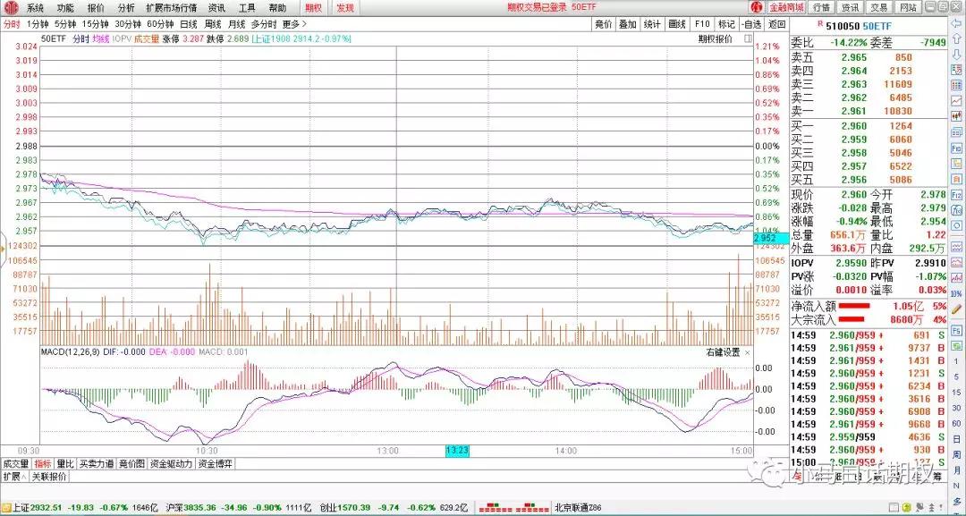 (2)经常翻看各个时间周期的50ETF技术指标,比如金叉、死叉、背离等,从短周期到中周期,再从中周期到短周期。经常查看主力期权合约的持仓量、成交量、仓差、主动性买卖单、净仓量等情况。