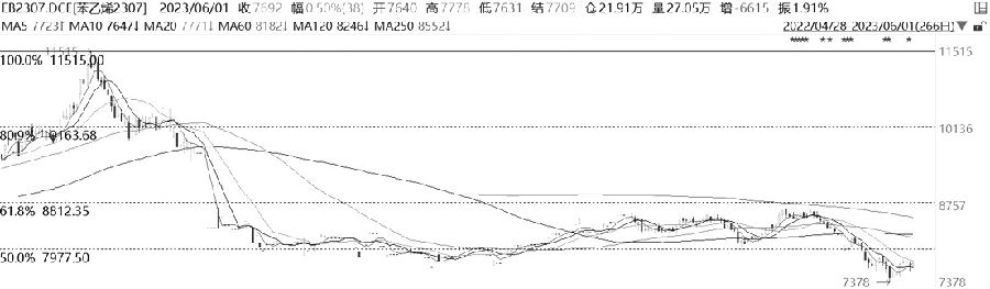 2021年10月,PVC期货创下上市以来11730元/吨的高点之后持续下挫,跌至5577元/吨才逐步止跌。之后,PVC期货价格缓慢上行,但是反弹至黄金分割0.236对应的6580元/吨的压力位受阻,价格重回弱势。目前,PVC期货价格临近5577元/吨的低点附近,均线系统呈现近似空头排列,近期5日均线开始上穿10日均线,说明短期价格有止跌走强的迹象。MACD指标低位金叉,KDJ指标、RSI指标金叉后发散。量仓方面,近期价格有止跌迹象,稳中有升,说明空头回补使得价格超跌反弹,下跌动能有所减弱。 苯乙烯 20日均线压制