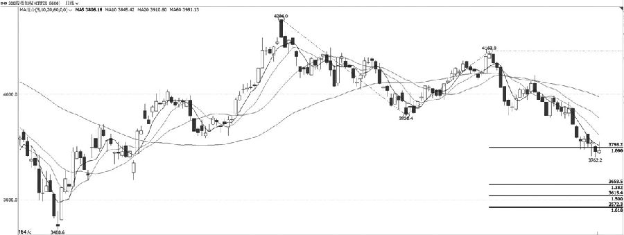 IF加权本周价格沿5日均线振荡走弱,并跌破3800点一线技术支撑。量能方面,本周价格下跌过程中成交量一度有所放大,持仓量整体先增后减。指标方面,均线系统延续空头运行,MACD指标快慢线跟随价格走弱,但绿色能量柱并未持续放大。综合来看,IF加权日线振荡走弱,建议偏空思路对待,下方关注3660点一线的支撑表现。 IC 向上试探