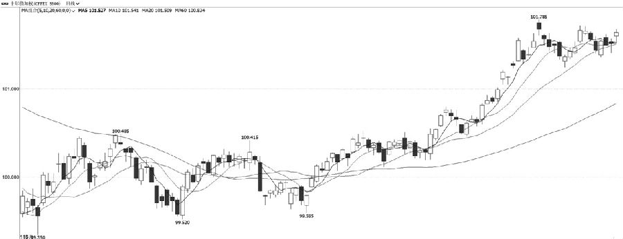 IC加权本周价格出现反弹,并向上测试6050点一线的压力,该位置是前期技术支撑,破位后由支撑转为压力。量能方面,本周价格反弹过程中成交量和持仓量均变化不大。指标方面,均线系统整体走势偏弱,MACD指标快慢线则在零轴下方刚刚交出金叉。综合来看,IC加权本周反弹测试上方压力位,建议6050点一线没有被突破的情况下以偏空思路对待。 十债 挑战前高