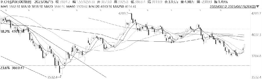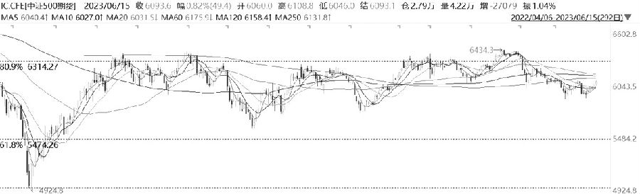 IF主力连续合约接连上破下跌通道上沿和60日均线,走势转强。但是,在黄金分割0.382对应的4100点的压力位受阻后,再度检验下方支撑。均线方面,呈现空头排列格局,但5日均线上穿10日、20日均线,说明短期价格存在止跌反弹需求。指标方面,MACD指标、KDJ指标、RSI指标均低位金叉,给出看涨信号。量仓方面,近期价格的企稳伴随着明显的减仓缩量,说明空头回补,IF下跌动能减弱。综合分析,IF有望走出一波反弹行情,操作上可轻仓试多。 IC 上冲高位受阻