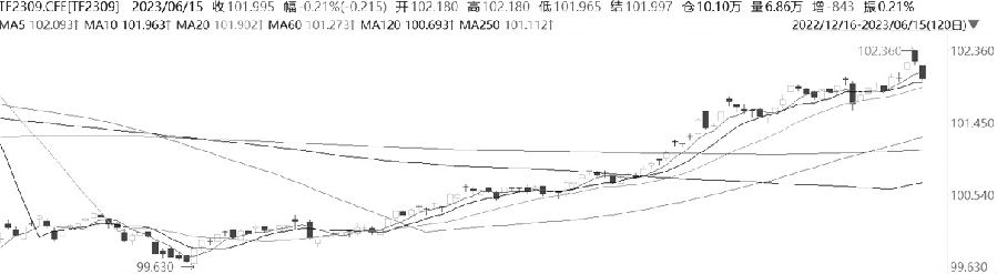 近期,IC主力连续合约多次上冲黄金分割0.809对应的6300点的压力位未果,价格高位振荡,运行区间在5750—6300点。 均线方面,近似空头排列,弱势格局并未改变,但5日均线上穿10日和20日均线,说明短期走势开始转强。指标方面,MACD指标、KDJ指标、RSI指标均低位金叉,且MACD指标出现底背离迹象,说明IC行情存在反转迹象。量仓方面,近期价格波动过程中伴随着明显的减仓缩量,说明空头回补,IC下跌动能正在减弱。综合分析,IC上下两难,后续将继续高位振荡。 五债 MACD顶背离