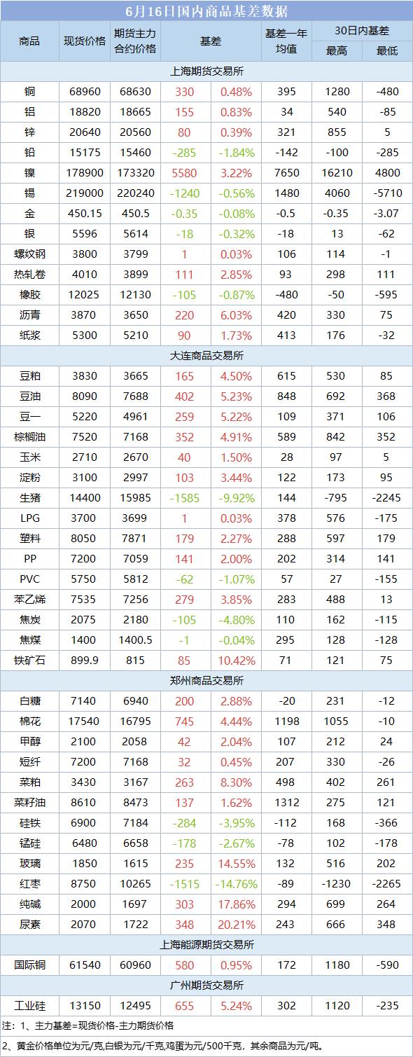 基差报告:6月16日国内商品基差数据一览