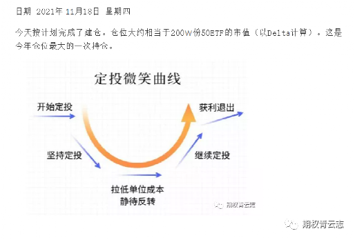 50ETF今天的表现相当的惊艳。下午的大逆转来的有些意外,却又在情理之中。房地产,证券,银行,集体异动,尤其是房地产板块,不止一次躁动了。年底的吃饭行情静悄悄地来了。 还记得我昨天的“定投微笑曲线”吗?我不知道上涨哪天会来,但我知道他一定会来。 远期实值期权,相对较少的时间价值,为长期投资50ETF提供了很好的工具。