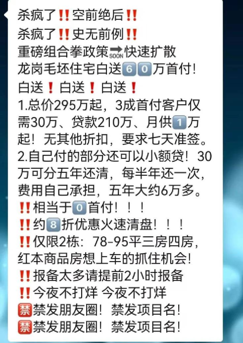 为了快速回笼资金,各家房企可谓挖空心思,套路五花八门。 开发商号称可零首付购房,买房送房 澎湃新闻了解到,近期无锡有一楼盘宣传称可以零首付购房。记者以购房人的身份拨打售楼处电话询问具体政策,楼盘销售人员称,目前的确有零首付购房的政策,购房者仅需支付5万元定金就可以购房,目前给出了20个优惠名额。但至于具体的操作方式,该销售人员表示,需要购房者去线下看房再介绍,在电话中销售人员并不愿意对此事多说。 该楼盘为融创城铁未来中心,楼盘位于惠山区-前洲,站北路与西塘中路交汇处,开发商为无锡融宏城市建设发展有限公司。 值得一提的是,澎湃新闻在查询资料时发现,融创无锡官方微信在2023年5月14日发布过该楼盘的消息,称“1成首付,15万起轻松购房”。 ![]() 仅过了半个月,该楼盘的促销方式已变成支付定金5万元即可购房。 在地产下行的当下,开发商花样百出的促销并不少见,如推特价房、买房送装修、送物业费、送车位等等,事实上这也是一种变相降价的行为。 除了上述开发商推出的“零首付”购房之外,还有开发商开启了买一套送一套、买房低首付、买房送黄金等卖房模式。 西安金色港湾楼盘宣传买一套送一套。这里的买一套送一套并非同小区住宅或者其他产权住宅,而是购房者可以获得连续3年(每年3月-11月)海南文旅项目的免费居住权益,海南的文旅项目是三亚的碧桂园清水湾,购房者可有免费机场接送权益,但需要自行承担居住期间的水电费和物业费。 另外,还有开发商宣布购房送黄金。 6月14日,澎湃新闻咨询了位于杭州市临安区的华发荟天府项目的置业顾问,该置业顾问表示,之前的确有买房送黄金的活动,楼盘之前打出“购房可返黄金700克起,最高可返1050克黄金”的活动,但目前送黄金的活动已经被叫停,后续何时重启并不清楚。 该名置业顾问介绍,之前是只要购房者买相应房源、付款到位,贷款资料在审核没有问题之后,售楼处便会返还购房者相应的黄金,而且会签订额外协议。 据了解,上述送黄金的活动为楼盘的第四和第五批次房源。具体来看,若购房者购买第四批次房源的89平方米户型可享受返还黄金700克,100平方米户型返黄金850克,119平方米户型返黄金1000克;购买第五批次房源的89平方米户型可返黄金900克,100平方米户型返黄金1050克。 今年2月份,深圳龙岗区信诚缙悦花园开售,中介在发布的宣传海报中称“首付仅需30万元,买深圳全南向三房”。 从中介发布的消息来看,该楼盘最低总价295万元起,以三成首付来算,正常需要缴纳88.5万元的首付,但中介称,首付仅需30万元。另外还宣称:“自己付的部分可以小额贷,30万元可分5年还清,每半年还一次,费用自己承担,五年大约6万元。相当于零首付!” ![]() 2月19日,深圳龙岗区信诚缙悦花园的开发商发布了一则声明称,“缙悦花园项目一期(2-4栋)于2022年7月获取预售证,但在市场、行业、疫情的多重影响下,项目销售滞缓。开发商为促进销售,对部分房源制定了价格优惠促销策略,促销内容为:仅对项目78平方米和115平方米户型的部分房源进行优惠,总房款优惠价在30万-60万元之间。客户在支付首笔定金后可锁定房源,首付交齐后完成相应合同签订及备案,均按要求的规范流程执行。针对近期项目促销折扣被渠道部分经纪人错误解读,导致出现‘龙岗一项目首付30万’、‘开发商送60万’等信息被大量传播。同时,由于现场管理疏忽,导致我司销售人员、中介经纪人、购房客户之间对于折扣的理解出现较大偏差。对于当天现场在信息未充分了解情况下交纳了诚意金的8批客户,开发商也将做出无条件退款处理。” 对于项目“低首付”一事,有报道援引深圳市龙岗区住建局的工作人员的话表示,“低首付是明令禁止的。送两成首付,相当于私自下调备案价,2月17日信城缙悦花园开始宣传购房优惠,18日我们就查处了。” 据信城缙悦城(缙悦花园)官微资料显示,开发商信城集团是央企中国信达的成员企业,截至2021年底已进入深圳、上海、苏州、长沙等城市,共获取项目11个,总投资规模近300亿元。 “整体市场供需两淡” 6月13日,克而瑞研究中心在发布的一则报告中称,5月份房企融资总量创2020年以来单月新低。 数据显示,5月份80家典型房企的融资总量为263.29亿元,环比减少56.4%,同比减少60.4%,为2020年以来单月融资的新低。房企债券发行了178.46亿元,环比减少49.3%,同比减少59.8%。债券类平均融资成本为3.34%,环比下降0.05%,同比下降1.26%。 6月15日,国家统计局公布的5月份70个大中城市商品住宅销售价格变动情况显示,5月份,商品住宅销售价格环比上涨城市个数减少,新建商品住宅和二手住宅销售价格环比上涨城市分别有46个和15个,比4月分别减少16个和21个。 从新房看,各等级城市房价涨幅全线回落。国家统计局数据显示,5月份,一线城市新建商品住宅销售价格环比上涨0.1%,涨幅比4月回落0.3个百分点,其中北京、上海和广州环比分别上涨0.2%、0.3%和0.1%,深圳下降0.2%;二线城市新建商品住宅销售价格环比上涨0.2%,涨幅比4月回落0.2个百分点;三线城市新建商品住宅销售价格环比由4月上涨0.2%转为持平。 从克而瑞地产研究中心发布的今年前5个月中国房地产企业销售TOP 100排行榜来看,前5个月排名前三的开发商分别为保利发展、万科和中海地产,销售额分别为1956亿元、1658.6亿元和1463亿元。 从企业表现来看,20