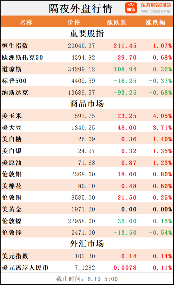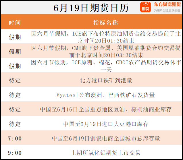 外盘收报![]() 每日精选2665元/吨!氧化铝期货首批合约上市挂牌基准价公布!现货市场表现如何? 巴中棉花贸易以人民币结算?“只是时间问题”!新季国内市场有变数 碳酸锂期货将上市!赣锋锂业、江特电机、永兴材料申请交割厂库 价格或重回60万元/吨? 宏观产经央行网站:中国人民银行、金融监管总局、中国证监会、财政部、农业农村部近日联合发布《关于金融支持全面推进乡村振兴加快建设农业强国的指导意见》,对做好粮食和重要农产品稳产保供金融服务、强化巩固拓展脱贫攻坚成果金融支持、加强农业强国金融供给等九个方面提出具体要求。 央视网:国常会研究推动经济持续回升向好的一批政策措施。会议指出,当前我国经济运行整体回升向好,随着前期政策措施的出台实施,市场需求逐步恢复,生产供给持续增加,物价就业总体平稳,高质量发展稳步推进。 财政部网站:1-5月累计,全国一般公共预算收入99692亿元,同比增长14.9%。其中,中央一般公共预算收入45851亿元,同比增长13.1%;地方一般公共预算本级收入53841亿元,同比增长16.5%。全国税收收入84774亿元,同比增长17%;非税收入14918亿元,同比增长4.5%。 品种资讯黑色系&金属期货 螺纹钢:247家钢厂高炉开工率83.09%,环比上周增加0.73个百分点,同比去年下降0.74个百分点;高炉炼铁产能利用率90.32%,环比增加0.65个百分点,同比增加0.17个百分点;钢厂盈利率51.95%,环比增加8.23个百分点,同比增加9.96个百分点;日均铁水产量242.56万吨,环比增加1.74万吨,同比下降0.73万吨。(Mysteel) 民生证券指出,供需双弱格局下钢材总库存继续去化,钢企利润回升。短期基本面上,钢材表观消费再度回落,后续期待跟随经济逐步复苏。库存方面,总库存继续去化,分品种看,钢铁除热卷外所有品种库存均有下滑。供应方面,伴随钢厂利润开始回暖,钢材供应小幅回升。整体看,钢材当前仍处于供需双弱格局,近期伴随钢价回升,钢企利润开始回暖。(证券时报网) 铁矿石:全国45个港口进口铁矿库存为12849.94万吨,环比增227.68万吨;日均疏港量296.17万吨降4.67万吨。(Mysteel) 全国钢厂进口铁矿石库存总量为8484.19万吨,环比增加13.34万吨;当前样本钢厂的进口矿日耗为294.75万吨,环比增加1.93万吨,库存消费比28.78,环比减少0.14天。(Mysteel) 煤炭:全国16个港口进口焦煤库存为532.0万吨增30.7万吨;其中华北3港焦煤库存为149.5万吨增15.5万吨,东北2港52.8万吨减0.8万吨,华东9港213.7万吨减4.0万吨,华南2港116.0万吨增20.0万吨。(Mysteel) 工业硅:本周国内工业硅期现价格均延续下行态势。其中,现货市场,冶金级工业硅价格环比上周下跌300-800元/吨,主流价格在13000-13800元/吨;化学级工业硅价格较上周下跌700-900元/吨,主流价格在13700-14200元/吨。(中国有色金属工业协会硅业分会) 氧化铝:上期所根据《上海期货交易所交易规则》等有关规定,现将氧化铝期货合约上市挂牌基准价通知如下:AO2311、AO2312、AO2401、AO2402、AO2403、AO2404、AO2405、AO2406合约的挂牌基准价为2665元/吨。(上期所) 黄金:世界黄金协会6月16日发布报告称,截至5月底,中国官方黄金储备已达到2092吨,较上月增加16吨,实现连续第七个月上涨。世界黄金协会表示,历史规律表明,未来几个月的上游实物黄金需求可能仍不温不火,或许会限制境内外金价溢价的走高,但在三季度有望开始回升。(世界黄金协会) 农产品期货 大豆:国家粮食交易中心公告,2023年6月20日13:30在国家粮食和物资储备局粮食交易协调中心及联网的各省(区、市)国家粮食交易中心组织开展进口大豆竞价交易,竞价交易进口大豆31.5万吨,生产年限2021年。(新华财经) 棕榈油:据船运调查机构SGS公布数据显示,预计马来西亚6月1—15日棕榈油出口量为437107吨,较上月同期出口的525738吨下降16.86%。(新华财经) 棉花:亚洲-巴西农业联盟(ABAA)CEO、巴西棉花种植者协会(ABRAPA)国际关系总监马塞洛·杜阿特·蒙特罗16日对记者预测,巴西棉花对华出口量在未来几年有望超过美国,并且可能以人民币直接进行结算。(环球网) 据中国棉花信息网,6月16日中国棉花价格指数(CCIndex)至17540元/吨,较上个交易日上调35元/吨。(新华财经) 鸡蛋:当前新开产蛋鸡量有所增加,在产存栏呈增加趋势,鸡蛋产能整体上来说继续呈宽松态势,供给水平逐步抬升。而近期国内持续高温,鸡蛋质量问题增加,业内看空心理明显,各环节继续低库存运行,下游也多随用随采,家庭居民等终端下游补货积极性较差,鸡蛋消费整体来看仍较为疲软。(中国饲料行业信息网) 生猪:6月16日,全国农产品批发市场猪肉平均价格为19.14元/公斤,与上周五(6月9日)的19.29元/公斤相比,下降0.8%。(澎湃新闻) 牧原股份6月17日在互动平台表示,目前公司商品猪养殖完全成本约为14.9元/kg,育肥阶段日增重在800g以上。(界面新闻) 能化期货 原油:据路透社此前报道,巴基斯坦石油部长穆萨迪克·马利克近日表示,巴方从俄方购买了10万吨石油,部分已运抵巴基斯坦港口,巴基斯坦使用了人民币进行支付。(央视新闻客户端) 液化气:截至6月15日当周,全国259家液化气生产企业,液化气商品量总量为51.18万吨左右,周环比下降1.80%。(隆众资讯) 纯碱:远兴能源6月16日在互动平台表示,阿拉善天然碱项目一期共4条生产线,计划于2023年6月起逐线投料试车,具体时间视装置试车运行的情况而定。(界面新闻) 橡胶:虽然多数全钢胎样本企业延续平稳运行,山东广饶地区个别