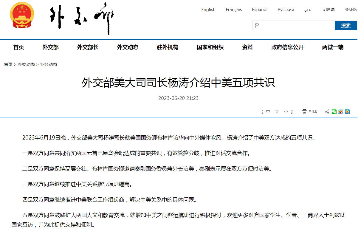 2023年6月19日晚,外交部美大司杨涛司长就美国国务卿布林肯访华向中外媒体吹风。杨涛介绍了中美双方达成的五项共识。 一是双方同意共同落实两国元首巴厘岛会晤达成的重要共识,有效管控分歧,推进对话交流合作。 二是双方同意保持高层交往。布林肯国务卿邀请秦刚国务委员兼外长访美,秦刚表示愿在双方方便时访美。 三是双方同意继续推进中美关系指导原则磋商。 四是双方同意继续推进中美联合工作组磋商,解决中美关系中的具体问题。 五是双方同意鼓励扩大两国人文和教育交流,就增加中美之间客运航班进行积极探讨,欢迎更多对方国家学生、学者、工商界人士到彼此国家互访,并为此提供支持和便利。 ![]() 相关报道布林肯结束访华 外交部美大司司长介绍情况 布林肯访华 什么信号? 中美关系 和合为贵 持续5个半小时!中美外长举行建设性会谈 双方同意保持高层交往 (文章来源:外交部网站) (责任编辑:admin) |
