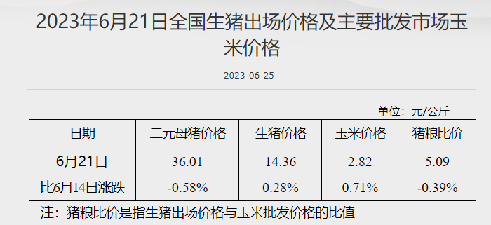 猪粮比价为5.09 较6月14日下跌0.39% 国家发改委 06月26日 据国家发改委数据,截至6月21日,全国生猪出场价格为14.36元/公斤,较6月14日上涨0.28%;主要批发市场玉米价格为2.82元/公斤,较6月14日上涨0.71;猪粮比价为5.09,较6月14日下跌0.39%。 (文章来源:国家发改委) (责任编辑:admin)