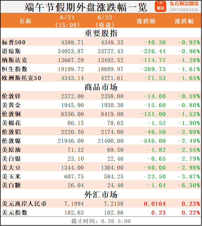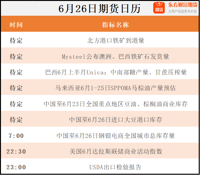 外盘收报![]() 每日精选山西加快焦化行业调整升级 年内将全面关停4.3米焦炉 拒绝内卷!四大养猪巨头签《互不挖人公约》! 硅料价格一个月内接近“腰斩” 光伏产能过剩警报已然拉响? 宏观产经澎湃新闻:6月23日,更多反映国际投资者预期的离岸人民币对美元盘中接连跌破7.20、7.21和7.22关口,日内下跌超过200点,续创去年11月底以来的新低。 财联社:鲍威尔强调,“美联储承诺将控制通胀,绝大多数的货币政策委员都相信目前正在接近(这一目标),但在加息这件事情上,还需要再往上走一点点。”在最新的点阵图中,FOMC委员对2023年政策利率的中值预期是5.6%,约等于还有两次25基点的加息。 央视新闻客户端:北方高温自6月20日发展以来,气温迅速攀高,北京、天津、河北、山东等地已有21个国家站的日最高气温突破历史极值,其中天津大港、北京汤河口气温达到41.8℃,37℃以上的高温影响面积约为45万平方公里,40℃以上的影响面积为10万平方公里。 品种资讯黑色系期货 螺纹钢:2023年6月中旬,重点统计钢铁企业共生产粗钢2262.66万吨、生铁2018.14万吨、钢材2167.52万吨。其中粗钢日产226.27万吨,环比增长1.42%,同口径相比去年同期增长0.21%,同口径相比前年同期下降5.54%;生铁日产201.81万吨,环比增长0.73%,同口径相比去年同期下降0.55%,同口径相比前年同期下降2.32%;钢材日产216.75万吨,环比增长5.04%,同口径相比去年同期下降1.68%,同口径相比前年同期下降5.13%。(中国钢铁工业协会) 上周,唐山126座高炉中有52座检修,高炉容积合计34600立方米;周影响产量约81.69万吨,产能利用率76.33%,较上上周增加1.07%,较上月同期减少1.38%,较去年同期增减少0.84%。 6月25日,全国250家长、短流程代表钢厂废钢库存总量467.71万吨,较前一工作日增4.27万吨,增0.92%;库存周转天9.3天,较前一工作日增0.2天;日消耗总量45.58万吨,较前一工作日降1.16%;日到货总量46.65万吨,较前一工作降0.40%。 截至6月25日,江苏地区钢厂铁水成本2468元/吨(不含税),张家港重废价格2580元/吨(不含税),铁水比废钢价格低165元/吨。(Mysteel) 铁矿石:2022年9月,全球最大钢企中国宝武和全球铁矿石巨头力拓(Rio Tinto)就西澳大利亚皮尔巴拉地区的西坡铁矿项目成立合资企业。据最新透露,该项目建设目前正紧锣密鼓进行中,预计将于2025年建成投产。(澎湃新闻) 焦炭:近期国内焦炭迎来反弹,山东、河北等地部分焦化企业小幅提涨50-60元/吨。焦煤价格期现同涨,现货方面不同煤种涨幅不一,部分优质品种涨幅达到200-400元/吨。(华夏时报) 农产品期货 农产品:土乌防长通电话,讨论了黑海港口农产品外运协议的最新情况,并认同延长该协议对全球粮食问题的重要性。(财联社) 大豆:USDA的作物进展报告及干旱监测报告显示,美国大豆优良率从62%进一步下滑至59%,大豆主产区干旱面积占比从上一周的39%骤升至51%,达到2012年以来的最高水平。受天气炒作影响,市场担忧美豆主产区干旱程度加剧,优良率和单产下降,国内外油脂油料板块应声上涨。(期货日报) 原本定于6月21日公布的美国生物燃料强制掺混目标(RVO)在6月20日夜间遭遇泄露,其显示RVO计划量的提高幅度完全低于市场预期。(期货日报) 棉花:在去库加快、供应预期收紧支撑下,棉花市场走势偏强;随着新订单跟进不足,产业链需求端边际转弱,纱布累库进度加快,棉花价格上涨向下传导困难。预计传统淡季市场将呈现花强纱弱特征,产业链利润将季节性反向修复。(新华财经) 小麦:据阿根廷布宜诺斯艾利斯证券交易所,预计阿根廷2023/24年度小麦种植面积为610万公顷,而先前估计为630万公顷。(财联社) 生猪:据中国养猪网的数据,6月23日,生猪(外三元)价格为14.17元/公斤,与上周五(6月16日)的14.24元/公斤相比,下降0.5%。从一周均价来看,本周生猪均价为14.29元/公斤,与上周14.22元/公斤的均价相比,上涨0.5%。(澎湃新闻) 有色/贵金属期货 有色:伦敦金属交易所(LME)公告,将铜的保证金从680美元/吨下调至634美元/吨,将锡的保证金从3443美元/吨上调至3505美元/吨,将镍的保证金从5301美元/吨下调至4983美元/吨,将铅的保证金从200美元/吨下调至175美元/吨,从2023年6月28日收盘后生效。(财联社) 铜:世界金属统计局(WBMS)公布的最新报告显示,2023年4月,全球精炼铜产量为223.72万吨,精炼铜消费量为232.01万吨,供应短缺8.29万吨。 伦敦金属交易所周四公布的数据显示,在注销仓单大幅增加后,LME铜注册仓单降至2021年10月以来的最低水平。(新华财经) 黄金:端午假期期间,中国证券报记者走访多家黄金卖场了解到,近期金价有所回落,消费者购买黄金的热情较高。业内人士认为,长期来看,黄金仍具有配置价值,建议买入后长期持有。(中国证券报) 能化期货 原油:美国至6月16日当周EIA原油库存减少383.1万桶至4.63亿桶,降幅0.82%;当周美国战略石油储备(SPR)库存减少171.9万桶至3.5亿桶,降幅0.49%。 印度第二大炼油企业BPCL正在和俄罗斯石油公司Rosneft谈判,根据一项以迪拜基准定价的定期协议购买俄罗斯石油,数量为约600万吨。(财联社) 燃料油:新加坡企业发展局(ESG),截至6月21日当周,新加坡燃油库存减少271.5万桶,至1853.5万桶的四周低点。(新华财经) 液化气:河北建投唐山LNG(液化天然气)项目投产大会21日在河北省唐山市曹妃甸区召开,标志着该项目第一阶段投产,年供气能力约70亿立方米。(河北日报) 玻璃:中国建筑玻璃与工业玻璃协会数据显示,产量方面,1-5月,光