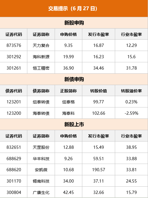 沪深股市:6月26日,沪指跌1.48%,报3150.62点,深成指跌1.68%,报10872.3点,创业板指跌1.16%,报2186.25点。互联网、传媒、软件、游戏、教育、通信等TMT赛道重挫,电力、公用事业、燃气板块逆市走强。 沪深港通:6月26日,北向资金净买入21.17亿元。浪潮信息、美的集团、工业富联分别获净买入8.36亿元、5.96亿元、4.53亿元。五粮液净卖出额居首,金额为7.44亿元。 龙虎榜:6月26日,日内上榜龙虎榜个股中,资金净流入最多的是焦点科技,为1.21亿元。机构参与龙虎榜中个股共涉及42股,其中18股被机构净买入,凯赛生物被买入最多,为1.37亿元。另外24股被机构净卖出,金桥信息被卖出最多,三日净卖出4.63亿元。 融资融券:截至6月21日,上交所融资余额报7870.37亿元,较前一交易日减少40.56亿元;深交所融资余额报7201.19亿元,较前一交易日减少50.57亿元;两市合计15071.56亿元,较前一交易日减少91.13亿元。 中国证券报:在业内人士看来,下半年宏观经济和企业盈利有望回升,带动A股市场行情走向业绩驱动,当前业绩也超越地缘和政策因素成为后市股市的核心关注点。行业层面,家电、通信设备、汽车零部件、消费电子、医药等方向更值得投资者关注。 证券时报:一轮“减持风暴”正席卷AI行业。近期,多家国内外AI领域上市公司发布了减持公告。国外方面,全球AI芯片龙头企业英伟达近期遭到公司董事以及爱德蒙得洛希尔资产管理公司的减持。国内方面,昆仑万维、剑桥科技等AI龙头近期均遭遇减持。 中国基金报:据悉,第三批中证国新央企系列指数公募产品已经获准发行,此次获批的产品,由嘉实、工银瑞信、博时基金三家公募巨头申报,跟踪标的均为“中证国新央企现代能源指数”。截至目前,今年以来上报获批的中证国新央企系列指数公募产品已达9只,其中,已成立的5只产品在发行期大卖,募资总规模接近百亿体量。 上证报:目前已有头部基金公司尝试把“客户盈利比”纳入销售考核体系,业内正在研究其可操作性。客户盈利比是种绝对收益指标。如果实行,那销售人员就不是卖得越多越好、让基民交易越多越好了,可能将视线投向所销产品的盈利能力、基民换手率等影响最终持有结果的因素。 中证报:有投资者表示,最近买的理财又开始亏损,以前一周还能有几十块收益,现在已经是负收益。近期理财市场波动确有加大,部分产品一度净值回落。但业内认为,此次债市调整仅为短期的市场变化,调整空间有限,不具备引发银行理财大幅亏损的基础。 证券时报:截至目前已有49家上市公司对2023年半年报业绩做出预告,预增、续盈、略增、扭亏等业绩预喜类型的公司合计超过40家。若按预告净利润同比增长下限计,有15家公司预计2023年上半年净利润同比增速超过三成,部分公司增速惊人。 经济参考报:2023年即将过半,纵观新股发行市场,IPO上市数量和募资规模与去年同期相比均有下滑。今年以来共160只新股登陆A股市场,去年同期为171只。募资规模方面,年内新股累计募集资金为1962亿元,去年同期募集资金3119亿元,同比下滑逾37%。 证券时报:6月以来,基金公司合计调研379家上市公司。以申万行业划分,机械设备公司数量居首,多达51家;医药生物排名第二,43家公司上榜;电子、计算机和电力设备紧随其后,被调研公司数量均在30家及以上。上述五大行业个股合计占比49.6%。 中证报:首批中证国新央企现代能源ETF已获证监会批复,包括嘉实基金、博时基金、工银瑞信基金三家旗下的中证国新央企现代能源ETF。目前,三只中证国新央企现代能源ETF发行募集上限还未确定,发行期预计在七月上旬。 中信证券:从Gartner模型视角看,复合集流体2019年之前处于“技术萌芽期”,以金美新材料为代表,进行了多年的研发;2021年开始行业开始进入“期望膨胀期”,尤其是2022年新进入者众多,市场预期达到了高峰;一季度处于“泡沫破灭低谷期”,技术进展和行业发展有所放缓,但近期广汽发布弹夹电池,将使用复合集流体,金美新能源也规划了大规模的投产计划,2023年下半年至2024年上半年,随着量产能力的提升和订单的逐步落地,行业将迎来“稳定增长期”阶段,该阶段有望成为行业的最佳配置期。 民生证券:未来负极集流体主要材料,PET复合铜箔产业化加速。随着市场对铜箔性能要求的不断提高,锂电铜箔经历了从多孔型电解铜箔、涂炭铜箔、高性能锂电铜箔到超薄铜箔的迭代发展。PET铜箔是一种以PET作为导电薄膜,两边分别以铜箔为镀层的夹层状的新型动力电池集流体材料。与传统锂电铜箔相比,PET铜箔具有安全性强、提升电池能量密度和降低成本等优点,未来有望成为行业发展的新趋势。据统计,2022年我国动力电池累计产量达到545.9GWh,同比增长148.5%。预计2025年动力电池需求达到1.5-1.6TWh,PET复合铜箔相对应的市场容量约为100-150亿元。 国金证券:从产业链来看,相比设备环节,中游复合箔材玩家明显更多,由于复合铜箔价值量较高,相关企业的业绩弹性较大。真空镀设备中,电源、真空泵目前价值量占镀膜设备成本25%、20%,国产替代空间较大,预计2025年复合集流体真空泵市场空间9.6亿元,2030年市场空间33.3亿元,电源市场2025年12亿元,2030年41.6亿元。水镀环节零部件国产化率较高基本无瓶颈。电镀供应链成熟,无产业链瓶颈。总体来看,电镀环节的上游零部件产业化较为成熟,基本实现了国产化替代。 国泰君安:相比传统金属集流体,