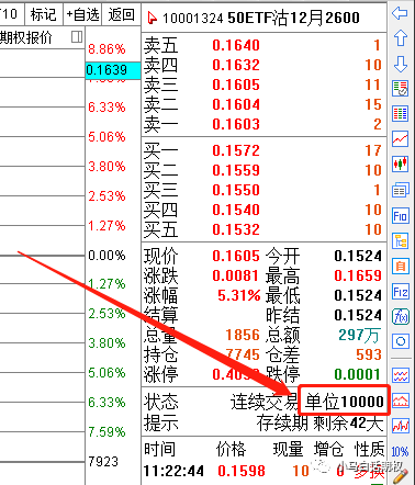 图3 分红前单位为10000 3. 买卖交易 4. 流动性 加挂接近一倍的期权合约后,会减弱原来的期权合约流动性,一般人喜欢新开仓标准合约,而不再买卖原来的非标准合约。尤其是该月合约快到期时,流动性不好,看卖方和买方谁的力量更强大,于是出现了图1和图2那两档行权价接近,但是末日涨幅差别较大的情况。一般建议早点移仓到标准合约。