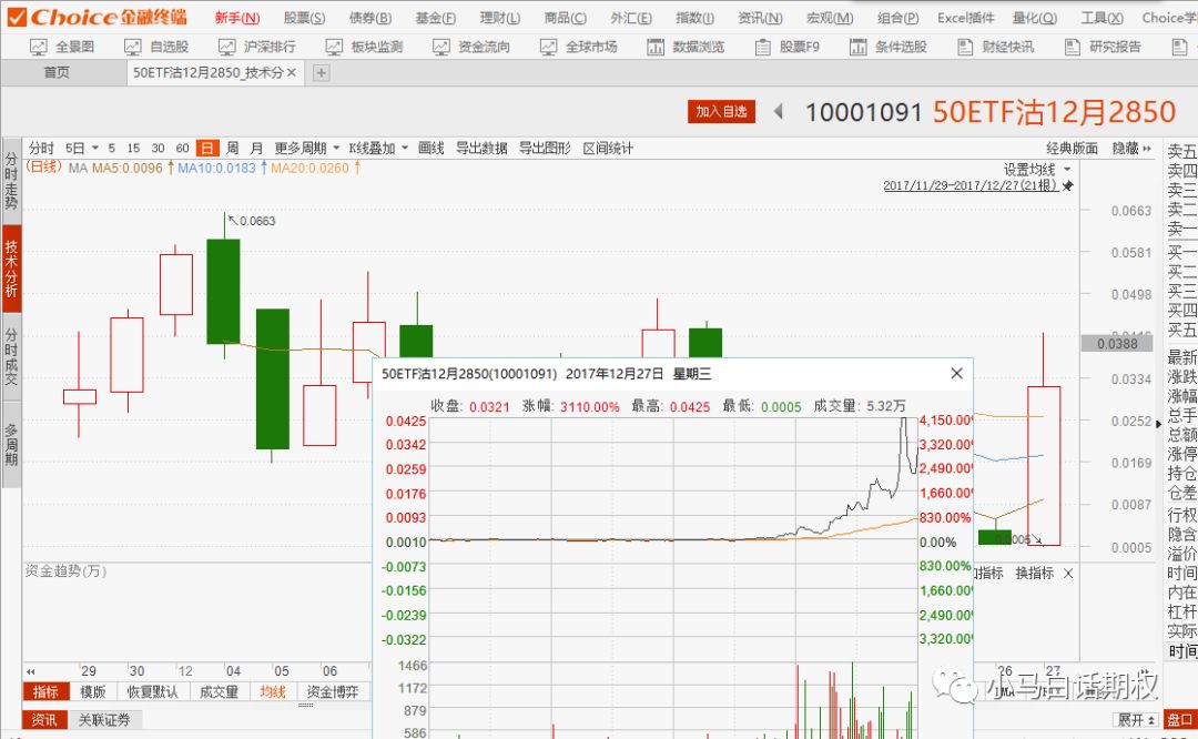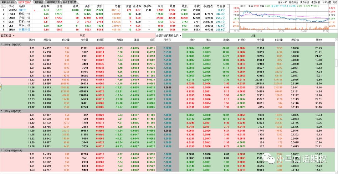 图2 50ETF沽12月2850 2. 价格数量 不管是原来的合约改了名字,还是新加挂的合约,你持仓的期权合约的价格和数量并不会变化,只是名字更改了。同样,原来带A的期权他的合约数量不再是10000份,2018年的12月合约加A后,对应的单位为10220。有的软件在你买入时,带A的合约会按价格*10220来计算。