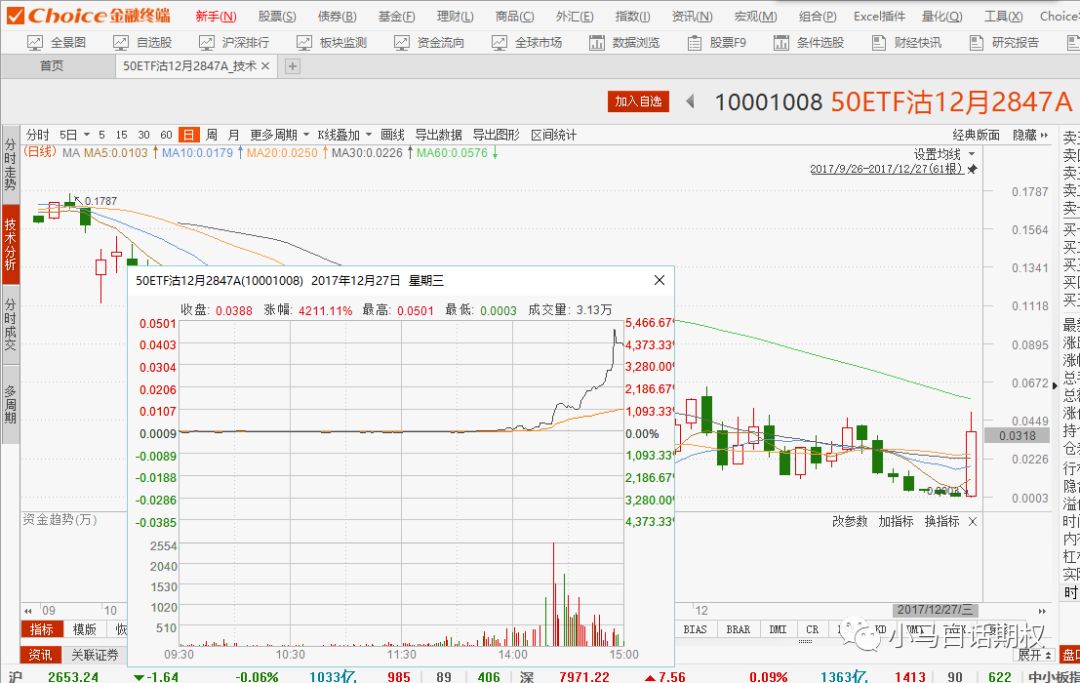 分红后,原来的期权合约会变更名称 ,并在名称之后加上A字,例如2017年12月的末日涨幅达40多倍的期权合约为50ETF沽12月2847A(图1),就是由原来的50ETF沽12月2900改名而来。新加挂的为标准合约(图2),总量基本会增加小一倍,即每个月平值和上下4档虚实值共9档合约,为12.1.3.6四个月份,到时候会更加眼花缭乱。