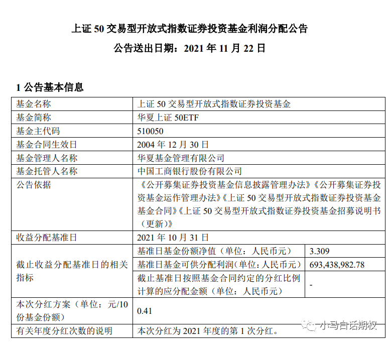 一、分红方案 每份华夏上证50ETF分红0.041元。 实际上就是每股50ETF的价格会下降0.041元,比如当前是3.241元,分红后价格会变为3.241-0.041=3.2元,另外有部分现金会到股票账户。 目前三个期权标的在价格上的区别。