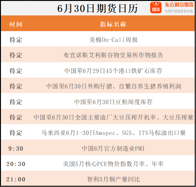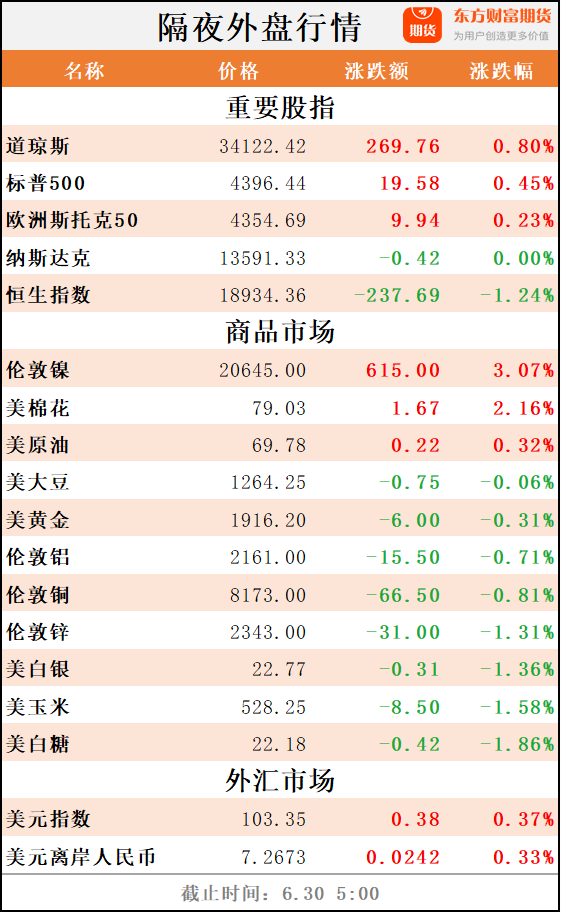 外盘收报![]() 每日精选骆铁军出席煤钢行业交流机制工作会和全国煤炭交易会 美国原油库存超预期下降 油价涨势能否延续? 国际原糖大跌影响几何 需求旺季将至 国内糖价能否“挺住”? 宏观产经央视网:李强主持召开国务院常务会议,审议通过《关于促进家居消费的若干措施》。会议指出,家居消费涉及领域多、上下游链条长、规模体量大,采取针对性措施加以提振,有利于带动居民消费增长和经济恢复。要打好政策组合拳,促进家居消费的政策要与老旧小区改造、住宅适老化改造、便民生活圈建设、完善废旧物资回收网络等政策衔接配合、协同发力,形成促消费的合力。 新华社:国务院日前印发《关于在有条件的自由贸易试验区和自由贸易港试点对接国际高标准推进制度型开放的若干措施》,率先在上海、广东、天津、福建、北京等具备条件的自由贸易试验区和海南自由贸易港,试点对接相关国际高标准经贸规则,稳步扩大制度型开放。 新华财经:6月28日,英美欧日四大央行行长同台亮相,出席欧洲央行举行的央行论坛。美联储主席鲍威尔称,利率限制性时间不够长,不足以让通胀达目标,预计会有更多的紧缩,多数决策者预计今年再加息两次,不排除两次会议连续加息,预计核心通胀到2025年时才能回落到美联储2%的目标。 品种资讯黑色系期货 钢矿:本周,钢材总库存量1580.76万吨,环比增36.22万吨。其中,钢厂库存量454.34万吨,环比增19.01万吨;社会库存量1126.42万吨,环比增17.21万吨。 本周,唐山92座高炉中有17座检修(剔除长期停产及淘汰产能),检修高炉容积合计13780m3;周影响产量约30.33万吨,周度产能利用率为88.34%,较上周增加0.24%,较上月同期减少1.07%。唐山主流样本钢厂平均铁水不含税成本为2594元/吨,平均钢坯含税成本3405元/吨,周环比上调21元/吨,与6月29日当前普方坯出厂价格3540元/吨相比,钢厂平均盈利135元/吨,周环比增加19元/吨。 本周,Mysteel统计新口径114家钢厂进口烧结粉总库存2433.04万吨,环比上期降30.4万吨。烧结粉总日耗110.59万吨,降1.79万吨。(Mysteel) 煤炭:进入“迎峰度夏”阶段,但煤炭价格仅小幅波动,各方观望情绪依旧浓厚。下游库存持续高位,电厂以长协拉运为主,补库需求较弱,沿海煤炭运价持续下跌。(上海航运交易所) 农产品期货 鸡蛋:二季度随着市场供需差逐渐扩大以及饲料成本下降,鸡蛋价格跌至年内新低,且低于去年同期。卓创资讯监测数据显示,截至6月25日,二季度主产区鸡蛋均价为4.40元/斤,环比下跌4.97%,同比下跌4.76%,并跌至年内新低。展望三季度市场,一方面鸡蛋供应量增幅有限,而另一方面需求将进入旺季,鸡蛋价格或逐步涨至年内高位,符合近年鸡蛋价格的季节性波动特点。(新华财经) 棉花:根据澳大利亚权威机构的报告,尽管业界对下年度棉花生产前景不十分乐观,但从目前的情况看,澳棉产量仍难以降到450万包以下。报告称,澳大利亚大部分灌溉田的面积都保持稳定,个别地区有小幅升降,新南威尔士州南部的灌溉水供应和土壤条件非常好,面积预计同比显著提升。旱地面积可能低于预期,但休耕的地下土壤水分水平极好,种植前也不需要大量降雨。(财联社) 6月29日美棉M1-1/8到港价涨34元/吨,报15435元/吨;国内3128B皮棉均价暂稳,报17154元/吨;内外棉价差缩窄34元/吨至1719元/吨。(Mysteel) 生猪:6月19日—6月25日,全国规模以上生猪定点屠宰企业生猪平均收购价格为15.28元/公斤,较前一周上涨0.1%,较去年同期下降13.5%;白条肉平均出厂价格为20.07元/公斤,较前一周上涨0.1%,较去年同期下降12.9%。 截至6月29日14:00时,全国农产品批发市场猪肉平均价格为18.90元/公斤,较前一日上升0.2%。(农业农村部) 有色/贵金属期货 工业硅:中国有色金属工业协会硅业分会6月29日发布本周最新单晶硅片价格。N型单晶硅片均价报2.84元/片,环比下降5.65%;M10单晶硅片均价报2.75元/片,环比下降0.73%;G12单晶硅片均价报3.97元/片,环比下降7.67%。(新华财经) 铜:6月29日国内市场电解铜现货库存9.68万吨,较21日增1.19万吨,较26日增0.91万吨;上海库存5.97万吨,较21日增0.99万吨,较26日增0.51万吨;广东库存3.03万吨,较21日降0.18万吨,较26日降0.45万吨;江苏库存0.20万吨,较21日增0.05万吨,较26日持平。(Mysteel) 6月29日,上海有色网铜现货平均成交升贴水较前一交易日上涨50元,至升水315元/吨;持货商挺价惜售,下游维持长单提货,现货市场成交氛围依旧不活跃。(上海有色网) 能化期货 甲醇:由于价格持续偏低,内地甲醇工厂普遍亏损严重,开工率再度下降,供应呈持续缩减态势,且存在进一步减少可能。甲醇企业库存环比微降,其中华中、东北地区库存降幅明显,而内蒙古地区部分主流企业因近期存检修计划,保供长约客户暂未出货,且本周进入新的长约周期,长约提货速度有所放缓,库存环比积累。(隆众资讯) 原油:美国能源信息局在当日公布的数据显示,美国上周商业原油库存量为4.537亿桶,环比大幅下降960万桶,降幅显著超出市场预期。(新华财经) 尿素:6月29日,尿素行情坚挺,主流报价上调20-30元/吨。目前出厂报价多在2100-2200元/吨左右。(农时达情报) 纯碱:截止到6月29日,纯碱整体开工率90.30%,环比下降1.04%。周内纯碱产量60.34万吨,环比下降0.69万吨,下降1.13%。周内纯碱厂家总库存42.85万吨,环比下降0.88万吨,下降2.01%。(隆众资讯) 环球视野第一财经:明年FOMC票委、亚特兰大联储主席博斯蒂克周四表示,即使不进一