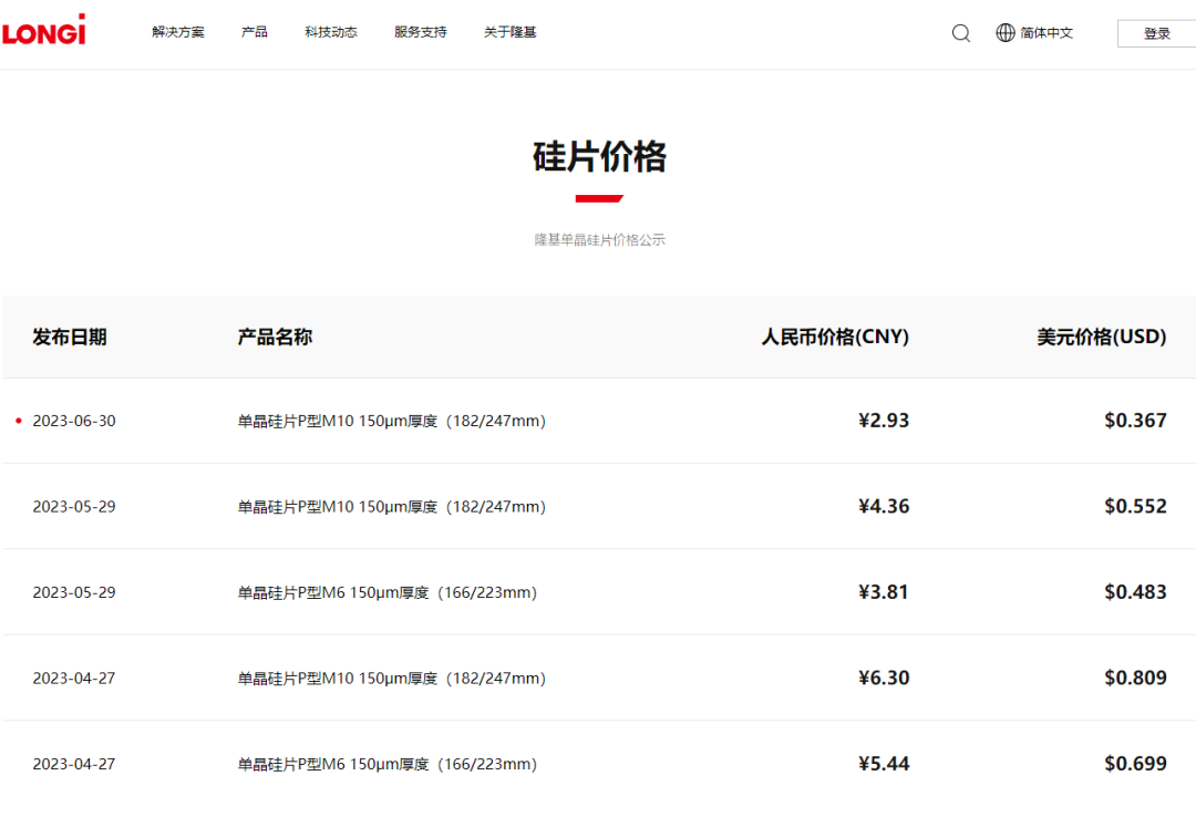 光伏行业再传重磅降价消息。 6月30日,有“光伏茅”之称的隆基绿能官网发布的价格信息显示,182mm单晶硅片的最新报价为2.93元/片,相较于5月29日公示的4.36元/片,下降1.43元/片,降幅32.8%。同时,取消166mm单晶硅片报价。 ![]() 来源:隆基绿能官网 业内人士表示,隆基绿能硅片价格均是每月末发布,而实际上硅片价格自六月第二周起已经连续三周企稳。总体来看,本轮硅料降价已接近尾声,继续下行空间有限,后续随着硅料价格的企稳,后市硅片价格也将随之企稳。 6月30日截至收盘,隆基绿能跌0.62%至28.67元/股,市值为2147亿元。 硅片价格较峰值跌去超六成 2022年4月以来,隆基绿能单晶硅片报价大幅下挫。相较于2022年7月的7.54元/片的阶段高点,当前隆基绿能单晶硅片价格降幅已超过60%。 隆基绿能月度硅片报价 ![]() 本报记者根据公开资料制图 6月29日,中国有色金属工业协会硅业分会(简称硅业分会)发布的最新单晶硅片价格显示,N型单晶硅片均价报2.84元/片,环比下降5.65%;M10单晶硅片均价报2.75元/片,环比下降0.73%;G12单晶硅片均价报3.97元/片,环比下降7.67%。 硅业分会预计,当前硅料价格基本接近企业平均生产成本,多晶硅价格继续下行空间较小,跌速或将逐步放缓,后续随着硅料价格企稳,硅片价格也将随后企稳。 伴随价格传导,光伏组件的价格也随之下滑。据Infolink本周三发布的最新数据,硅片价格为2.7元/片至2.9元/片,均价2.8元/片,略低于隆基此次的报价。 分析人士表示,按照当前硅片的价格,折合电池片的硅片成本约为0.38元/瓦至0.39元/瓦;相对于上个月报价,下降了约0.19元/瓦。 据记者了解,目前光伏组件的报价基本在1.3元/瓦至1.4元/瓦。“这两天我看了两个光伏组件企业开标,最低的报价为1.235元/瓦,龙头企业的报价也都在1.3元/瓦以内,价格都太低了。”一位光伏业内人士告诉记者。 近日,国家能源集团新疆公司2.1GW光伏发电项目组件设备采购公开招标项目开标。据了解,该招标项目吸引了20余家组件企业投标。参与该项目投标的一位头部光伏组件企业员工告诉记者,目前组件企业报价确实很低,价格能维持在1.3元/瓦至1.4元/瓦就不错了。 利好下游电站开发商 硅业分会专家委员会副主任吕锦标在接受中国证券报记者采访时表示,目前光伏下游非一体化配套的硅片产能过剩严重,多晶硅价格回落释放的利润,未来很难在硅片端停留。 “上游原材料价格下降,光伏组件价格随之下降,将大大提高电站开发商的积极性,刺激终端需求释放,有利于提高光伏电站的投资收益率。”吕锦标称。 6月8日,晶科能源股份有限公司董事长李仙德在《把硬仗的氛围感拉满》一文中,通过一组对话生动描述了国内光伏组件市场的竞争情况:“所有没有海外营销力的、没有品牌的二线三线(企业)都挤在这个‘寺里’,僧多粥少,‘住持’又只看价格,不问芳华。” 李仙德表示:“接下来只会‘僧更多粥更少’,‘住持’更粗暴。这个时候,全球化能力就显高下了。” 由此可见,光伏组件的全球化能力已成企业竞争的重要方向。隆基绿能在2022年年报里也曾表示,目前,产业链部分环节已出现阶段性过剩,叠加越来越多的跨界资本和企业涌入光伏行业,行业竞争加剧。同时,全球贸易壁垒将导致行业制造产能分散化,企业的全球化经营能力将成为竞争的焦点,包括市场营销、技术研发、商业模式创新、融资能力、运营管理等,全球化竞争能力不强的企业将逐渐丧失竞争力并逐步退出市场。 (文章来源:中国证券报) (责任编辑:admin) |
