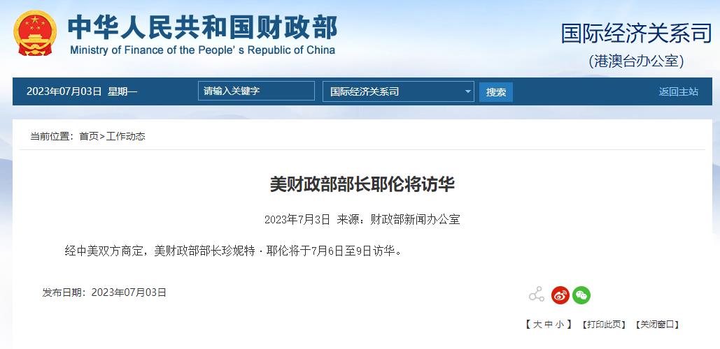 经中美双方商定,美财政部部长珍妮特·耶伦将于7月6日至9日访华。