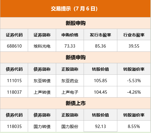 沪深股市:7月5日,沪指跌0.69%,报3222.95点,深成指跌0.91%,报11029.3点,创业板指跌0.91%,报2212.42点。小金属板块逆市大涨,有色金属、能源金属板块涨幅居前,电机、船舶制造、风电板块跌幅居前。 沪深港通:7月5日,北向资金净卖出40.35亿元。贵州茅台、隆基绿能、三花智控分别获净卖出3.04亿元、2.06亿元、1.98亿元。中国船舶净买入额居首,金额为3.28亿元。 龙虎榜:7月5日,日内上榜龙虎榜个股中,资金净流入最多的是云南锗业,为1.74亿元。机构参与龙虎榜中个股共涉及33股,其中12股被机构净买入,金科股份被买入最多,三日净买入0.92亿元。另外21股被机构净卖出,康恩贝被卖出最多,净卖出2.33亿元。 融资融券:截至7月4日,上交所融资余额报7839.71亿元,较前一交易日减少0.27亿元;深交所融资余额报7165.93亿元,较前一交易日增加23.46亿元;两市合计15005.64亿元,较前一交易日增加23.19亿元。 中国证券报:从31个申万一级行业近5年实际表现看,2023年至今,累计涨幅居前的国防军工板块,在最近5年里每年7月均实现了正收益,通信、农林牧渔、机械设备也是7月上涨概率较高的板块;相比之下,计算机、食品饮料、轻工制造等板块同期多半负收益;公用事业板块最近5年7月表现整体较为稳定,而追求赔率的投资者或可关注电力设备等方向机遇。 中国证券报:申万宏源·2023资本市场夏季策略会在上海举办,千余人次共聚一堂,探讨2023年下半年宏观经济形势、A股市场等话题。申万宏源认为,2023年下半年,经济“N型复苏”温和向上的第三阶段有望开启,A股将迎来相对有机会的窗口,主题思维继续主导市场。 每日经济新闻:知名媒体人胡锡进发文称,7月5日账面损失1051元,增持三只股票,两补仓已持股票,一只新购股票,均当日跌1%以上。目前持有五只个股,两只基金,持股金额达到了13万元。 财联社:端午前后两周时间里,前“公募一哥”任泽松旗下产品陆续大跌20.14%、25.41%,合计跌幅达45.55%,这种断崖式的净值走势让一众业内人士为之侧目。截至6月底,任泽松管理的这只产品年内最大回撤达到了41.77%,夏普率-0.23,波动率则高达67.11%。 证券日报:截至7月4日,券商累计承销债券数量达16627只,总承销金额超6万亿元,同比增长4813.01亿元。一方面,光大证券、中泰证券、国开证券等位居“千亿元俱乐部”之列;另一方面,也有部分中小券商在不同类型债券承销方面展现出优势。 上证报:上半年公募基金发行规模突破5000亿元,其中债券型基金占比超六成。与此同时,由于资金对于债券型基金的青睐,近期还有混合型基金转型为债券型基金。大批增量资金涌入债券型基金。公募基金市场共成立613只产品,募集资金总额达5286.3亿元。 证券日报:上半年光伏行业60家企业发起近2000亿元融资。其中,45家上市公司通过增发融资1157.69亿元,11家公司发布可转债融资530.68亿元,3只新股上市融资46.59亿元,此外,行业龙头隆基绿能拟发行GDR募资不超199.96亿元。 中证报:近日,人民币汇率波动较大,离岸人民币对美元汇率一度跌破7.28关口,随后大幅反弹。今年以来,已有超340家A股上市公司通过外汇套保的方式规避外汇市场汇率波动风险。业内人士表示,随着汇率衍生品需求愈加旺盛,国内相关衍生品市场工具仍需进一步丰富。 证券日报:今年以来,大批私募机构纷纷走进上市公司开展调研。上半年,有超过3500家私募机构对上市公司进行调研,其中45家机构日均调研一次以上,科创板、创业板的上市公司受到机构“偏爱”。业内人士表示,加大一线调研力度有利于私募机构更快地把握市场脉搏,挖掘投资机会。 证券日报:研报“双随机”现场检查中超五成券商收到罚单。自5月18日首份罚单落地以来,截至7月4日,13地证监局已累计发布40张券商研报罚单家。研报是投资者投资决策的参考依据之一。全面注册制下,提高券商研报质量,有助于帮助普通投资者拓宽有效信息渠道。 证券日报:1-5月,ChatGPT全球访问量环比增幅分别为131.6%、62.5%、55.8%、12.6%、2.8%,增长幅度明显下降;6月ChatGPT的访问量环比下滑9.7%,为其推出以来首次。上半年,A股ChatGPT指数涨幅达71.77%,资金流入规模十分可观。 北京市:促进数字经济全产业链开放发展和国际交流合作,形成一批数据赋能的创新应用场景,培育一批数据要素型领军企业。力争到2030年,北京市数据要素市场规模达到2000亿元,基本完成国家数据基础制度先行先试工作,形成数据服务产业集聚区。 中证报:近期,全球食糖供应紧张形势出现缓解苗头。是供需宽松预期下国际糖价出现一轮急跌行情,洲际交易所原糖价格6月下旬一度跌超16%。业内人士认为,巴西主产区增产、物流拥堵改善等因素影响下,国际原糖价格近期急跌,国内糖价跟随调整但相对抗跌。 去哪儿:6月“研学游”产品销量环比增长4倍。专家表示,随着暑期到来,各类研学旅行产品层出不穷,成为新热点。当前,研学旅行市场表现出强劲增长势头,吸引了众多企业、机构抢滩入局,但行业管理规范、标准体系仍有待进一步健全。 群智咨询:全球消费者购买力走弱带来消费类电子产品需求持续疲软。预计2023年全球智能手机出货量减少至10.8亿部,同比下降约6.4%。终端需求在2021年达到顶峰后,连续第二年呈现下降趋势。此外,预计2023年全球可折叠智能手机出货规模将增长至约2100万部。 Research And Markets:全球入耳式耳机和头戴式耳机市场规模预计将在2032年达到1846.1