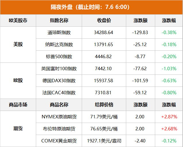 美股:标普500指数收跌8.77点,跌幅0.20%,报4446.82点。道指收跌129.83点,跌幅0.38%,报34288.64点。纳指收跌25.12点,跌幅0.18%,报13791.65点。 欧股:德国DAX 30指数收跌0.63%,报15937.58点。法国CAC 40指数收跌0.80%,报7310.81点。英国富时100指数收跌1.03%,报7442.10点。 亚太股市:7月5日,香港恒生指数收跌1.57%,报19110.38点;恒生科技指数收跌1.42%,报4016.53点;日经225指数收跌0.31%,报33320.50点。韩国KOSPI指数收跌0.55%,报2579.00点。 人民币:在岸人民币兑美元北京时间03:00收报7.2520,较上一交易日夜盘收盘跌350点。成交量413.70亿美元。 黄金:COMEX 8月黄金期货收跌0.12%,报1927.1美元/盎司。 原油:WTI 8月原油期货收涨2.00美元,涨幅2.87%,报71.79美元/桶。布伦特9月原油期货收涨2美元,涨幅2.68%,报76.65美元/桶。 英国金融时报:韩国将30年来首次允许新的本地金融机构进入该国银行业,意味着目前由五家大行主导的银行业竞争将加剧。将允许金融公司申请全国性商业银行牌照,被视作为促进行业竞争铺平道路,可能有助于降低消费者的利率成本。 日经中文网:任天堂的主力游戏机“Nintendo Switch”的销量在增加。6月的日本国内销量同比增长68%,作为6月创下历史最高纪录。《塞尔达传说》的新作品和以《马力欧》为题材的电影爆红,叠加汇率方面日元贬值的利好因素,入境游客(访日外国人)需求增加。 韩国进口车协会:6月在韩新登记的进口乘用车2.68万辆,同比增加17.9%,环比增加25.4%。进口车供给稳定、部分品牌新车上市,推动6月韩国新登记进口车同比增加。按品牌看,宝马以8100辆居首,梅赛德斯-奔驰以8003辆位居第2。丰田豪车品牌雷克萨斯以1655辆排名第3,沃尔沃和奥迪分列第4和第5。 越南工贸部:7月电力系统运行依然困难,特别是北部地区将出现天气炎热、水库水位低等情况。工贸部要求EVN密切跟踪负荷变化情况、电力市场运行等情况,确保国家电力系统安全稳定可靠运行。从现在到2023年底,全国生产生活用电基本不会发生短缺情况。