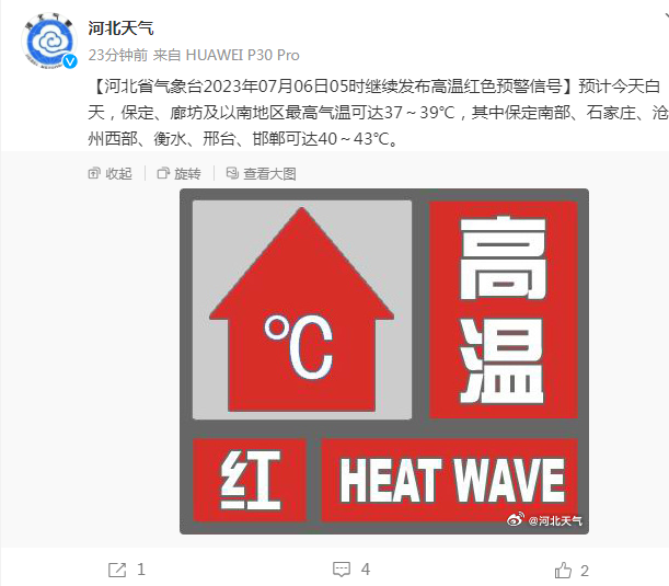 高温红色预警!北京今日大部分地区最高气温将超40℃!河北这些地方最高气温将达43℃