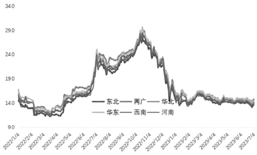 图为各区域生猪价格 定点样本企业数据显示,6月规模场能繁母猪存栏环比下降0.49%,散养户能繁母猪存栏环比下降3.01%。规模场普遍有信心和实力熬过当下行情低迷期,但多数中小散户资金实力薄弱,主动淘汰有所增加。