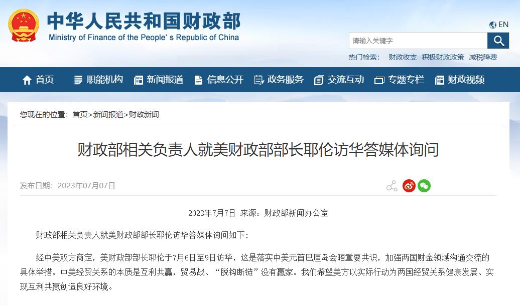 财政部相关负责人就美财政部部长耶伦访华答媒体询问 财政部网站 07月07日 财政部相关负责人就美财政部部长耶伦访华答媒体询问如下: 经中美双方商定,美财政部部长耶伦于7月6日至9日访华,这是落实中美元首巴厘岛会晤重要共识,加强两国财金领域沟通交流的具体举措。中美经贸关系的本质是互利共赢,贸易战、“脱钩断链”没有赢家。我们希望美方以实际行动为两国经贸关系健康发展、实现互利共赢创造良好环境。 (文章来源:财政部网站) (责任编辑:admin)