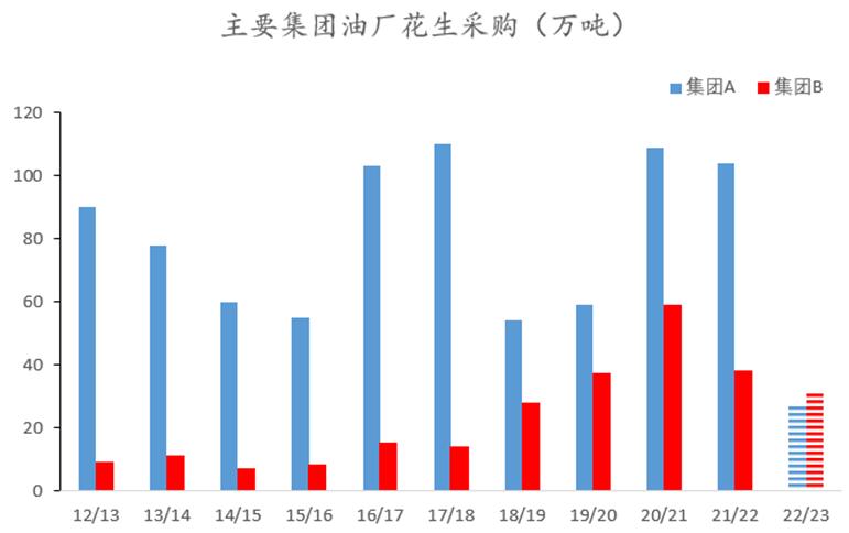 数据来源:国家粮食信息中心,CFC农产品研究 我们结合上海钢联数据拟合出的头部企业的花生采购量,如下图所示,预期在本年度整体采购量仅为上一年度的40%,花生油高价滞销逐步向上反馈到油厂的开机决策和采购策略。因此,22-23年度的减产很类似一块试金石,重新刻画了行业的需求刚性的不足——1.8万的花生油定价造成滞销,花生粕上行乏力,那么油厂对于单吨价格10000元以上的油料米买兴阑珊。