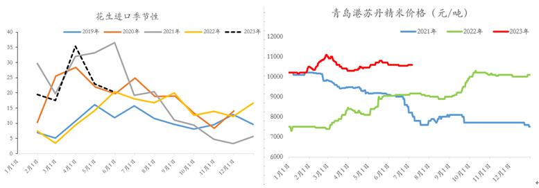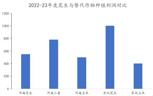 数据来源:CFC农产品研究(注:种植利润差异主要来自于东北的高单产和低人工费用) 从种植面积的结构比较上看,吉林扩大种植的积极性最为显著预计同比增加20%-30%,但此前的种植基数偏低;河南春花生种植面积减少最为显著。种植利润是驱动种植意向改变的主要因素,今年河南小麦的种植利润较花生高50%以上,且小麦的投入较少,在南阳和驻马店等春花生的传统产地基本看不到花生。辽宁和吉林因为单产优势,花生较之于玉米小麦有一定的种植利润的优势,因此种植面积继续扩大。 在去年极度减产年份,花生价格上涨的最大涨幅也仅有35%,2022-23年花生现货均价10.3元每公斤,相较于21-22年度同期8.35元每公斤,价格上涨23%。20%左右的YOY减产已经在我国农产品种植历史上属于极端事件,但涨幅不及预期我们理解或趋势性地抑制我国花生种植的自主性意愿。 减产年份,花生价格向上弹性不足的主要原因来自于下游的花生油价格上边际显著受制于海外定价的植物油,比如大宗花生油的定价很难上行超过18000元每吨,而花生粕4200元每吨,这么反推下来花生油压榨工厂为了确保压榨利润很难以高于10100元每吨的价格采购油料花生(出油率按45%,出粕率53%计算,压榨费用300元/吨计算,此处仅考虑现金成本)。 进口和天气对于产量的扰动 我们理解当下市场上关于花生面积扩种和对此的定价已经反映完全了,后面的主要博弈方向是进口节奏及夏季生长期天气,但上诉二者我们暂时欠缺高频跟踪的方式。