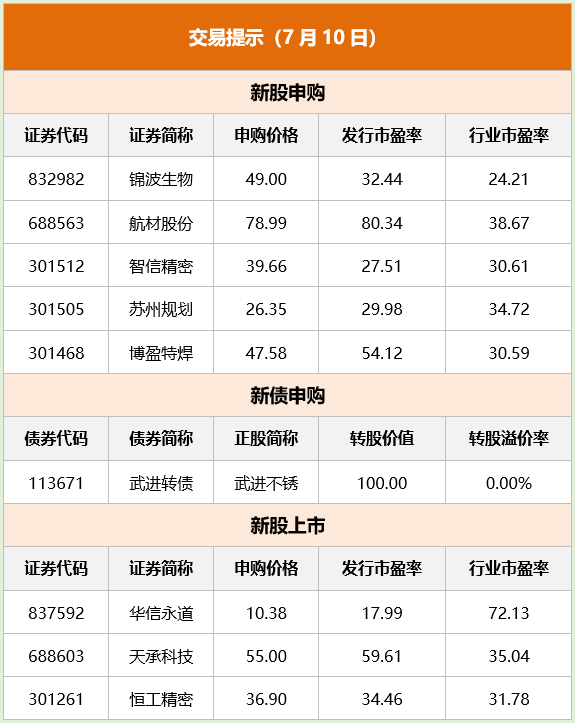 沪深股市:7月7日,沪指跌0.28%,报3196.61点,深成指跌0.73%,报10888.55点,创业板指跌1.05%,报2169.21点。农业、公用事业、电力、证券板块涨幅居前,风电、光伏、电机、电子元件板块跌幅居前。 沪深港通:7月7日,北向资金净卖出45.17亿元,连续4日减仓。贵州茅台、招商银行、中国平安分别遭净卖出5.73亿元、5.02亿元、3.78亿元;浪潮信息逆势获净买入2.06亿元。 龙虎榜:7月7日,日内上榜龙虎榜个股中,资金净流入最多的是恒邦转债,为2.7亿元。机构参与龙虎榜中个券共涉及30只(2只可转债),其中9只个券(2只可转债)被机构净买入,恒邦转债被买入最多,为2.71亿元。另外21股被机构净卖出,致尚科技被卖出最多,为1.06亿元。 融资融券:截至7月6日,上交所融资余额报7842.62亿元,较前一交易日减少0.16亿元;深交所融资余额报7180.57亿元,较前一交易日增加8.38亿元;两市合计15023.19亿元,较前一交易日增加8.22亿元。 新股申购:本周,共有10只新股申购,其中创业板6只、科创板3只,北交所1只,分别为维科精密、港通医疗、福事特、苏州规划、智信精密、博盈特焊、光格科技、康鹏科技、航材股份、锦波生物。 限售解禁:本周,共有93只限售股解禁,实际解禁数量共计93.47亿股,解禁市值达到923.30亿元。其中,中国电建以120.65亿元排名解禁榜第一,中国东航和中科星图分别以114.58亿元、86.53亿元排名第二和第三。 财联社:日前,摩根士丹利将大中华区半导体股票评价上调为具有吸引力。分析师表示,科技行业通缩、价格弹性、人工智能半导体需求,这三项因素将共同触发逻辑芯片的下一个上升周期,可能从第四季度开始。 中国证券报:截至7月7日,今年以来IPO审核通过率为84%,略低于去年同期88%的通过率。行业分布看,终止上市申请的企业中,来自计算机、通信和其他电子设备制造业的居多。专家分析称,从行业角度来看,计算机、通信和其他电子设备制造业涉及技术创新领域,市场竞争激烈,对于公司的财务状况、技术实力、市场前景等要求较高,盈利波动较大。 中国证券报:近期,多家上市公司发布新一轮重要股东增持计划。7月以来,已有6家上市公司发布增持计划。出手增持,主要是基于对公司未来发展前景的信心和成长价值的认可。从增持进展看,不少上市公司发布增持计划后,实施增持态度较为积极。部分上市公司实际增持金额远超计划增持下限。 财联社:资深媒体人胡锡进发文表示,中国股市虽然仍是世界第二大股市,但是总金额规模只有93.42万亿元,不到美国股市的30%,它进一步扩张的空间明摆在那里。中国到了更认真把股市当成与国家经济实力相称的投资场所来建设的时候。因为房市继续大规模扩张不被看好,很多老百姓手中的钱不知道往哪里去,只能存银行,股市理应成为资金接下来的重要去向。
