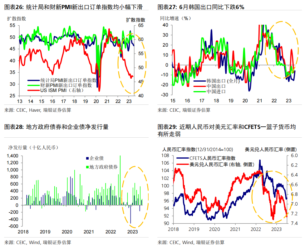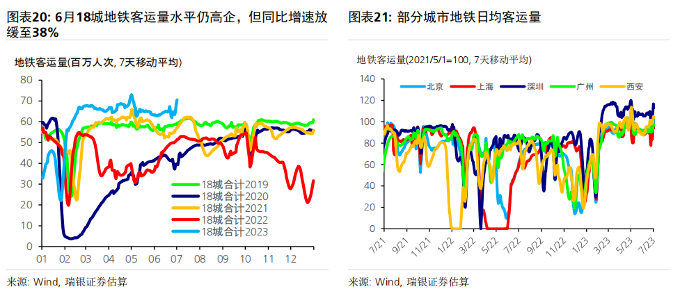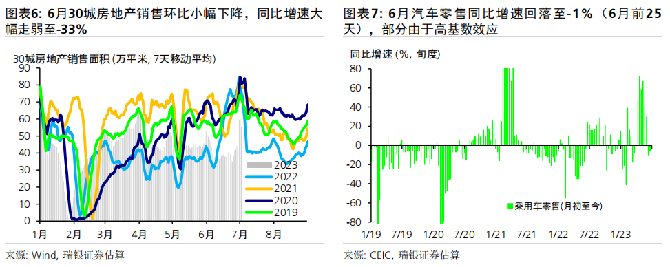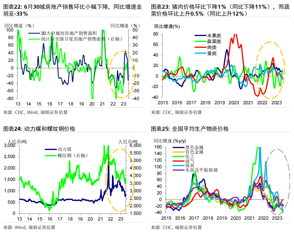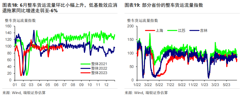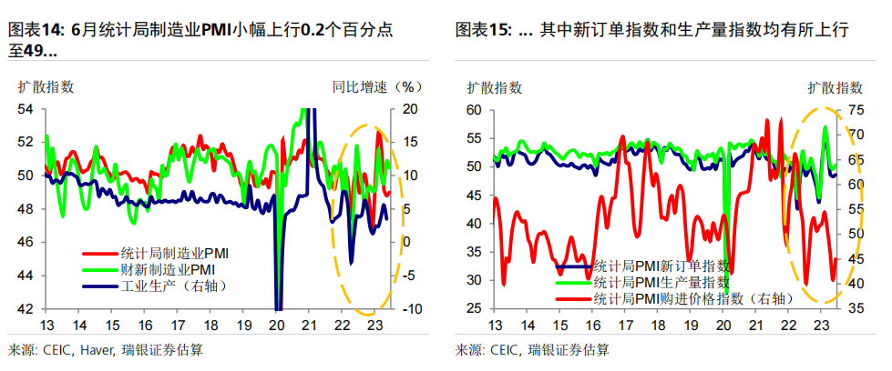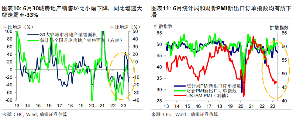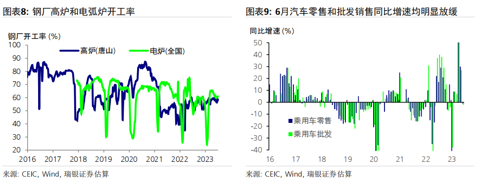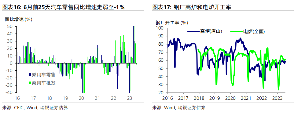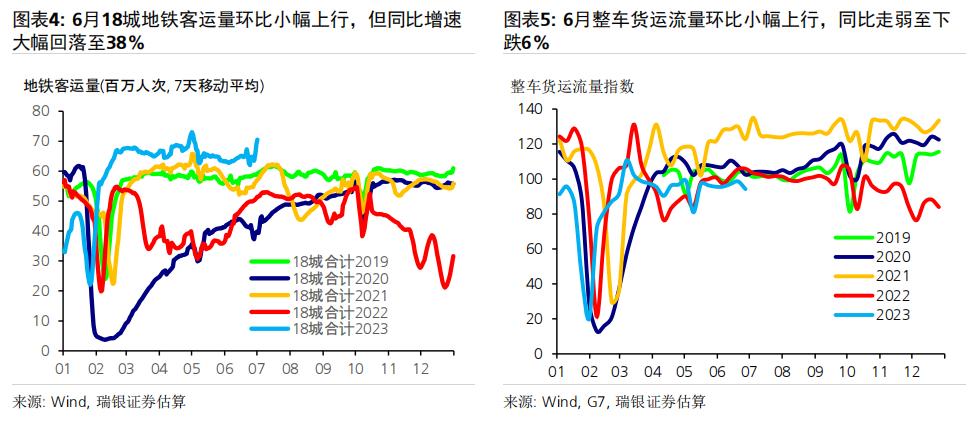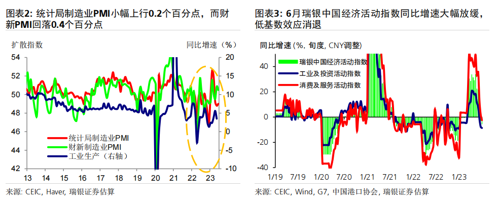 数据前瞻:6月环比动能疲弱,同比增速放缓;二季度GDP同比增长7.2% 6月统计局制造业PMI小幅上升0.2个点至49,而财新PMI下滑0.4个百分点至50.5,表明制造业动能较为疲弱。统计局非制造业PMI进一步下行至53.2,仍位于荣枯线之上。高频数据显示6月经济环比增长动能疲弱,基数效应消退拖累大部分经济活动指标同比增速放缓,包括房地产销售、整车货运流量指数、汽车销量和地铁客流量等。对于即将公布的宏观数据,我们预计6月工业生产(同比增长1.2%)、社会消费品零售(同比增长4.8%)、房地产销售(同比下跌15%)、整体固定资产投资(年初至今同比增长3.2%)和出口(同比下跌9%)的同比增速均在6月较5月有所放缓。信贷同比增速可能进一步放缓0.6个百分点至8.8-8.9%,主要由于政府债券发行同比大幅少增。PPI同比跌幅可能有所扩大(同比下跌5.2%),而CPI同比增速或小幅下行(同比0%)。二季度GDP环比折年增长率(季调后)可能大幅放缓至1-2%,但低基数可能推动其同比增速上行至7.2%左右。 政策支持有望温和加码,预计2023年GDP增速为5.2% 在近期央行降息之后,我们预计政策支持将继续温和加码、支撑经济增长。未来出台的政策支持可能包括:1)进一步放松房地产政策,如进一步放松二线城市购房限制,降低二套房贷款首付要求,增加“保交楼”资金支持,改善开发商融资条件等;2)增强财政和准财政扩张力度,提振基建投资(尤其是筹集和使用新一批政策性银行专项基建投资基金);中央政府可以向地方政府提供临时信贷和资金支持,以清偿其对企业供应商的欠款;但中央政府向居民部门直接发放大规模消费或收入补贴的可能性很小;3)进一步小幅降息,信贷支持加码以配合准财政政策的扩张,以及对部分地方融资平台债务进行重组或将其置换为成本更低的债务。我们预计在政策支持下,下半年消费活动会进一步温和复苏、房地产活动可能逐步企稳,经济增长环比动能或将有所回升。我们预计三、四季度GDP同比增速为4.3%和4.8%,带动2023年全年GDP增速约为5.2%。 ![]() PMI与高频数据更新 6月统计局制造业PMI小幅上行0.2个百分点至49.0,主要由生产量和新订单指数拉动。新订单指数上升0.3个百分点至48.6,而新出口订单指数进一步下降0.8个百分点至46.4。原材料库存指数和采购量指数进一步小幅下行,而产成品库存指数大幅下降2.8个百分点。购进和产出价格指数跌幅收窄,分别下跌4.2个和2.3个百分点,表明制造业面临的通缩压力略有缓解、但依然持续。生产量指数反弹0.7个百分点至荣枯线之上(50.3)。从业人员指数下滑0.2个百分点至48.2,反映出劳动力市场压力犹存。另一方面,财新PMI下行0.4个百分点至50.5,其中生产量和新订单指数走弱。统计局和财新PMI分化并不罕见,主要是由于统计样本存在差异,因此我们需要参考其他高频数据来印证制造业实际增长动能变化。 统计局非制造业PMI回落1.3个百分点至53.2,连续6个月保持扩张。其中,服务业商务活动指数进一步回落1个百分点至52.8,表明经济重启后,服务业活动仍处扩张区间,不过增速有所放缓。从行业看,航空运输、邮政快递、电信广播电视及卫星传输服务、货币金融服务、保险等行业商务活动指数均位于60及以上高位景气区间,而批发、房地产、居民服务等行业商务活动指数低于临界点。另一方面,建筑业商务活动指数下行2.5个百分点,但仍保持在55.7的稳健水平。 6月瑞银中国经济活动指数显示环比增长动能较弱,随着低基数效应消退,同比增速大幅放缓。6月30城房地产销售环比小幅下降,但由于去年基数较高,同比增速从5月的+25%大幅走弱至-33%。港口货物吞吐量同比增速大致持稳在5%,而粗钢生产同比跌幅略有收窄(二者均为6月前20天)。整车货运流量和18城地铁客运量均环比小幅上升,但同比走弱(分别从5月的同比下降3%/同比增长86%,走弱至同比下降6%/同比增长38%),部分由于基数效应消退。6月前25天汽车零售同比增速大幅走弱至同比下降1%,受高基数影响。因此,瑞银中国工业与投资指数(同比增速)下滑14个百分点,而消费与服务指数大幅下滑36个百分点,带动整体经济活动指数同比增速在6月回落25个百分点至-1%。 ![]() ![]() ![]() 数据前瞻:6月环比动能放缓,同比增长走弱;二季度GDP同比增长7.2% 对于即将公布的6月和二季度经济数据,我们估计: 6月工业生产同比增速可能放缓至1.2%。统计局PMI小幅上行0.2个百分点至49,其中生产活动指数回升0.7个百分点至50.3。财新PMI小幅下行0.4个百分点至50.5,受生产活动指数放缓拖累(回落2.8个百分点至51)。PMI表现不一反映出制造业生产环比增长动能依然较为乏力,但仍在扩张。唐山高炉开工率均值为58%(同比下降1个百分点),而电弧炉开工率均值为60%(同比上升4个百分点)。6月前20天粗钢生产同比跌幅从5月的8%收窄至6%。此外,水泥磨机的开工率环比大致持平,而石油沥青装置的开工率小幅上升,且均高于去年同期水平。物流运输可能较去年同期有所放缓,其中整车货运流量指数同比跌幅从5月的3%小幅扩大至6%。我们估计6月工业生产同比增速可能从此前的3.5%放缓至1.2%。 社会消费品零售同比增速可能放缓至4.8%,部分由于低基数效应消退。6月前25天乘用车零售同比增速从5月的30%走弱至同比下跌1%,而乘用车批发也从5月同比增长27%走弱至同比下降2%。18城地铁日均客流量小幅上升至6500万人次,但其同比增速从5月的86%大幅放缓至38%,由于去年