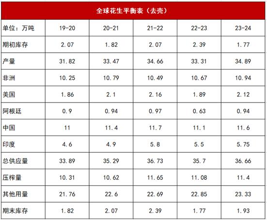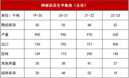 数据来源:油世界,CFC农产品研究 最近在海外市场一方面收到阿根廷2022/2023年度花生减产30万吨的向上抬升,但非洲超预期的出口量也极大程度缓解了全球贸易流偏紧的预期。 随着2022/2023年度减产在中国,阿根廷,美国和印度均有发生,全球平衡表比较明显的收紧趋势,下图主要引用油世界(德国)的数据源,2022/2023年度全球花生期末库存下降至至少5年新低至177万吨。在此驱动下,美国花生单吨均价同比上涨24%至1800元每吨以上,达到2012年以来最高水平。近期国际市场有进一步开启担忧阿根廷减产后的国际贸易流收紧,美国花生价格进一步上行至1970美元每吨(鹿特丹CIF)。 全球局面:阿根廷花生减产或难以逆转全球贸易流趋宽松的局面 我们已经能够体认到今年以来阿根廷的极端干旱天气,干旱导致花生仁占花生毛果的比重仅仅65%,目前阿根廷花生已经完成90%以上的收获进度,预计2022/2023年度去壳花生产量或将从上一年度的97万吨下降至63万吨。 但超市场预期的是2021/2022年度的累库过程实际支持了2023年1月至今的阿根廷出口总量:2023年1-5月阿根廷花生出口增长11%至30.7万吨的纪录水平,其中4-5月出口量11.1万吨(去壳)。未来下半年或出线阿根廷对全球市场出口减量的威胁,但美国20余万吨的增产,叠加中国和印度的增产,阿根廷对于市场影响有限。