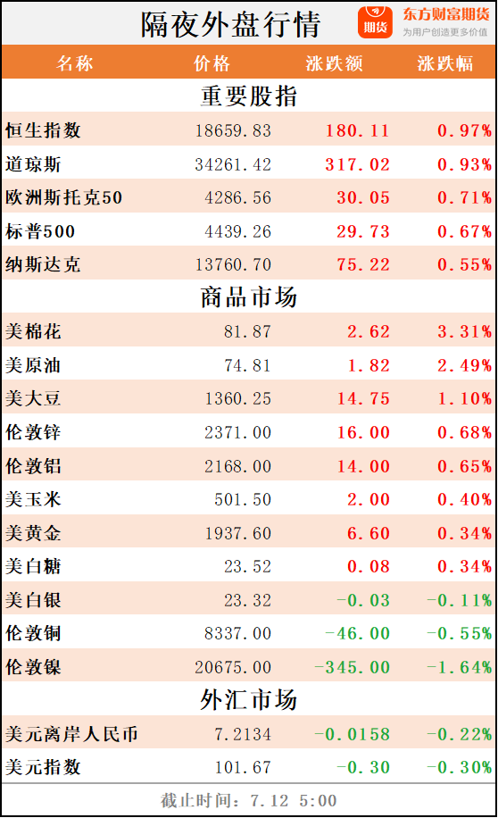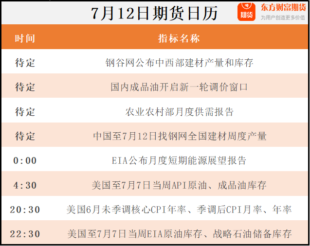 外盘收报![]() 每日精选超预期!6月金融数据全面发力,社会融资大增,降准预期升温?市场稳了? “白色石油”期货来了!锂电池产业链准备好了吗? 能繁母猪去化加速,龙头猪企“边亏边扩张”,何时能“见曙光”? 宏观产经央行网站:6月份,人民币贷款增加3.05万亿元,同比多增2296亿元。6月末,广义货币(M2)余额287.3万亿元,同比增长11.3%,增速分别比上月末和上年同期低0.3个和0.1个百分点。 财联社:中汽协数据显示,6月,汽车产销分别完成256.1万辆和262.2万辆,环比分别增长9.8%和10.1%,同比分别增长2.5%和4.8%。 品种资讯黑色系期货 螺纹钢:7月上旬粗钢产量环比略有下降。7月上旬全国粗钢预估产量3035.25万吨,上旬日均产量303.52万吨,环比6月下旬下降0.43%,同比上升11.14%。价格方面,7月上旬钢材现货市场价格震荡下跌。(Mysteel) 铁矿石:7月11日,Mysteel统计中国45港进口铁矿石库存总量12505.31万吨,环比上周一减少208万吨,47港库存总量13134.31万吨,环比减少221万吨。(Mysteel) 6月26日-7月2日期间,澳大利亚、巴西七个主要港口铁矿石库存总量1203.4万吨,周环比下降37.1万吨,库存连续三期回落,降至年均值以下水平。(Mysteel) 焦煤:11日山西市场炼焦煤偏强运行。钢厂开工高位,对原料需求较好,拿货积极性上升,市场情绪有所提振,对焦煤价格形成一定支撑,也助推竞拍小涨比例增多,线上多数煤种溢价成交。但终端实际需求仍偏弱,下游对高价煤接受程度一般,价格以震荡小幅波动为主,目前炼焦煤处于阶段性小幅反弹行情。(Mysteel) 7月11日长治沁源市场炼焦煤价格上涨,随着焦炭涨价落地,市场情绪提振,采购需求有所恢复,对原料煤适当补库。低硫瘦主焦煤A8,S0.5,G70最新成交均价1811元/吨较上期涨150元/吨,成交1.5万吨,以上为出厂价现金含税。(Mysteel) 农产品期货 棕榈油:据南部半岛棕榈油压榨商协会(SPPOMA)数据显示,2023年7月1-10日马来西亚棕榈油单产增加7.3%,出油率减少0.26%,产量增加5.93%。(新华财经) 玉米:7月11日储运公司玉米购销双向竞价计划交易数量13800吨,实际成交数量13800吨,成交率100%。(中储粮网) 7月11日美国玉米进口到岸价为266美元,较上日涨2美元,进口成本价为2213元,较上日涨7元,自两年半低点反弹。(中国粮油商务网) 棉花:7月8日,中国棉花协会在新疆乌鲁木齐召开培训会。信息员反映,今年4月中上旬,新疆受寒潮、低温、大风等不利天气影响,棉花生长发育期比正常偏晚10天左右,苗情长势差于去年,目前大部分棉区开始进行打顶工作。由于部分棉区政策性结构调整,有些地块改种了玉米、花生等其他作物,植棉面积较去年有所减少。(中国棉花协会) 2023年度中国棉花期初库存568万吨,较上期预测值下调50万吨,同比增长7.5%;产量581万吨,较上期预测值下调36万吨,同比下降13.5%。(中储棉信息中心) 生猪:国内外三元生猪价格较昨日呈现小幅下跌行情,在全国可监测的31个省/市/自治区中,猪价走势为10涨6平15跌。华中、华北、东北等地区猪价以下跌为主,整体跌幅为0.01-0.40元/公斤,最低为宁夏回族自治区,最高为广东省。(中国养猪网) 据农业农村部监测,2023年7月3日—7月9日,全国规模以上生猪定点屠宰企业生猪平均收购价格为15.14元/公斤,较前一周上涨0.4%,较去年同期下降32.3%;白条肉平均出厂价格为19.90元/公斤,较前一周上涨0.2%,较去年同期下降30.5%。(农业农村部网站) 有色/贵金属期货 有色:7月11日,伦敦金属交易所(LME)铜库存57075吨,减少2350吨;铝库存531725吨,减少2350吨;镍库存37878吨,减少66吨;锌库存72925吨,减少575吨;铅库存45800吨,增加1450吨;锡库存4255吨,增加90吨。(新华财经) 沪铜:7月11日上海保税区市场国际铜现货价格为61000元,上调230元。(Mysteel) 巴西商贸部数据显示,2023年7月截至第1周,共计5个工作日,巴西累计装出铜矿石和铜精矿2.2万吨,去年7月为5.97万吨。日均装运量为0.44万吨/日,较去年7月的0.28万吨/日增加54.7%。(新华财经) 沪铝:巴西商贸部数据显示,2023年7月截至第1周,共计5个工作日,巴西累计装出铝矿石和铝精矿0.08万吨,去年7月为52.19万吨。日均装运量为0.02万吨/日,较去年7月的2.49万吨/日减少99.32%。(新华财经) 沪锡:据Mysteel调研国内20家锡冶炼厂(涉及精锡产能31万吨,总产能覆盖率97%)结果显示,2023年6月精锡产量为13218吨,环比减少7.99%,同比增加14.62%,2023年1-6月国内精锡产量累计82551吨,累计同比增加0.36%。(Mysteel) 沪金:MKS PAMP金属策略顾问Nicky Shiels在上周发布的年中展望报告中表示,维持2023年底每盎司1,930美元的黄金均价预估,尽管金价在短期内可能仍处于下跌趋势。MKS预计今年下半年金价交易区间将介于每盎司1850-2100美元。(新华财经) 能化期货 玻璃:沙河市场经过阶段性火爆后市场情绪有所降温,今日东北市场价格仍有上调,其它市场情绪亦存在分歧,涨跌操作均存,整体观望氛围仍浓厚。昨日有关部门发布通知,房地产金融支持政策延期到2024年底,或有利于市场情绪修复,实际效果还需视终端需求而定。(隆众资讯) 进入7月份,玻璃市场交投有所好转,6月29日-7月6日13省周度库存环比微降0.08%。尤其近日主产区成交改善明显好于销区。沙河价格跌后反弹,中下游备货及期现提货支撑,产销良好带动价格反弹;湖北价格下跌后,价格优势改善,叠加当地中间商一定存货,产销好转。主销区华东华南中下游暂维持刚需采购。后市看,目前刚需改善暂有限,后期持续性仍需观望。(卓创资讯) 尿素:据农时达情