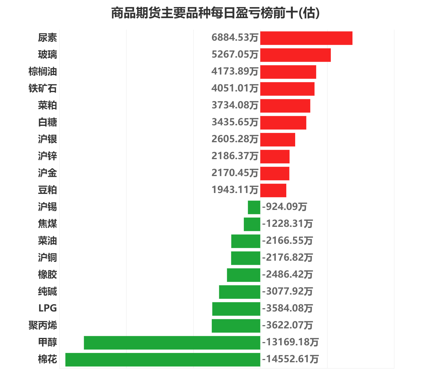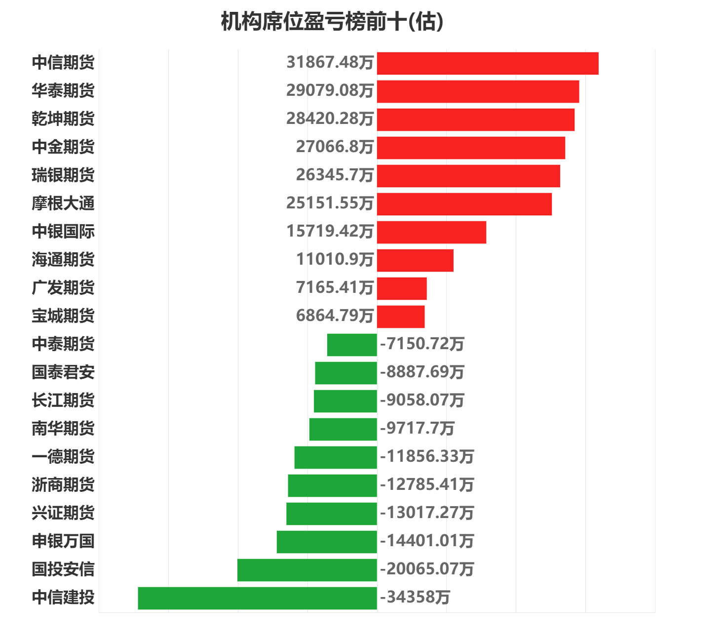 每日期货龙虎榜,带你深度了解市场。 市场一览:周三商品期货综合指数上涨0.25%,日内资金净流入25.16亿元。 市场成交量为2923.96万手,成交额为1.71万亿元。 持仓量为4261.85万手,较前一交易日减少5.39万手。 市场成交量前十和持仓量前十如下图所示: ![]() ![]() ![]() 品种盈亏榜:今日商品期货中尿素盈利第一,为6884.53万元。 棉花亏损第一,为14552.61万元。 ![]() 就尿素而言,今日盈利前三席位为方正中期、一德期货、中信建投,分别盈利2292.57万元、1769.32万元、1097.54万元。 今日亏损前三席位为国海良时、永安期货、申银万国,分别亏损902.77万元、891.33万元、840.93万元。 ![]() 就棉花而言,今日盈利前三席位为中信期货、永安期货、海通期货,分别盈利3076.00万元、2798.15万元、2724.56万元。 今日亏损前三席位为中粮期货、国贸期货、中国国际,分别亏损5691.13万元、4775.54万元、4594.23万元。 ![]() 席位盈亏榜:今日机构席位中中信期货盈利第一,为31867.48万元。 中信建投亏损第一,为34358.00万元。 ![]() 就中信期货席位而言,今日盈利前三品种为中证1000股指、棉花、沪深,分别盈利22718.23万元、3076.00万元、2437.58万元。 今日亏损前三品种为中证500股指、LPG、纯碱,分别亏损3393.27万元、1331.77万元、1178.83万元。 ![]() 就中信建投席位而言,今日盈利前三品种为尿素、焦煤、LPG,分别盈利1097.54万元、538.46万元、414.83万元。 今日亏损前三品种为中证1000股指、甲醇、中证500股指,分别亏损9012.65万元、8900.83万元、8507.24万元。 ![]() 注:可通过点击东方财富期货APP资讯页面“龙虎榜”及东方财富期货PC端左侧“龙虎榜”查看各类机构持仓及盈亏榜单信息。 ![]() ![]() 以上图表数据来源:东方财富Choice (文章来源:东方财富研究中心) (责任编辑:admin) |