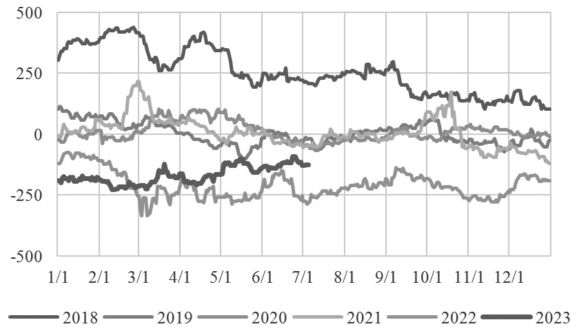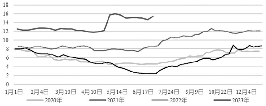 图为金属硅社会库存(单位:万吨) 除了头部企业外,约有200家硅企承担了市场另外一半的产量,平均每家硅企产量0.65万吨,并且能耗水平也存在较大差异,技术水平参差不齐。《能效水平2023年版》实施后,将推动行业生产者加快技术改造,能耗水平不达标的工业硅产能将加速出清,同时也对新增产能形成有效限制,有利于企业利润回暖。 今年以来,工业硅期货主力合约累计下跌22.05%。截至7月12日,工业硅期货报收于13950元/吨。工业硅价格下跌的主要原因是需求疲软,虽然光伏新增装机持续超预期,带动多晶硅需求增加,但有机硅和铝合金两大传统需求不佳对工业硅需求的拖累更甚,这也导致工业硅的市场库存累积至较高水平。同时,1—5月金属硅累计出口量24.1万吨,同比减少18%,海外需求下滑也令工业硅需求承压。 《能效水平2023年版》的出台,旨在加快产业实现绿色升级改造,淘汰落后低效产能,作用在于中长期行业的高效绿色发展,短期对工业硅盘面的影响有限,后续更应该关注供需基本面能否出现实质性改善。 [乙二醇] 目前,距离我国提出2030年前实现“碳达峰”的目标日期趋近,我国也在各方面积极推动织造业绿色发展、推进工业等领域清洁低碳转型。《能效水平2023年版》主要强调了强化能效水平引领、推动分类改造升级、完善相关配套政策等几个方面。 具体来看,本次增加的对乙二醇、PTA、粘胶短纤、化纤及混纺织物,加上之前的对二甲苯,基本占据整个聚酯产业链。重点关注领域中涉及的化工期货品种甲醇、纯碱、PTA、乙二醇等又恰好是高能耗、高污染的代表品种,大多数产业正处于产能过剩周期,且利润水平不佳,有待出清或技改优化。 以聚酯产业链中的乙二醇为例,2022年,乙二醇产量约为1324.8万吨,进口量约为750万吨,但下游需求无法完全消化乙二醇的供应。2022年,我国新增乙二醇产能580万吨/年。其中,煤制乙二醇新增280万吨/年,退出产能152万吨/年,总产能2503.7万吨/年。目前,煤制乙二醇和乙烯制乙二醇产能总计达到2649万吨,2023年乙二醇仍在产能扩张中。2023年,国内共有7个项目(包括三江、榆能、久泰等)、合计450万吨/年的乙二醇集中投产。其中,煤制乙二醇180万吨/年,总产能将接近3000万吨/年,年增幅高达18%。产业过剩、供需矛盾突出导致乙二醇长期处于亏损大、估值低的状态,成为聚酯产业链乃至整个化工期货品种中最弱势的品种。