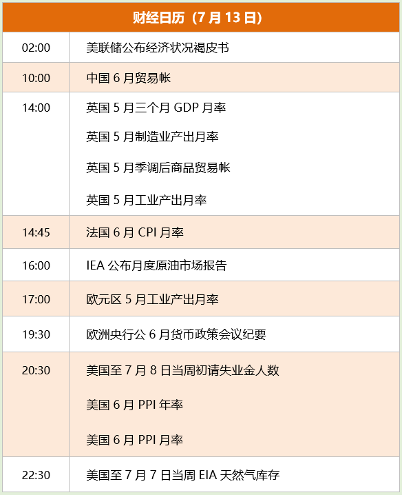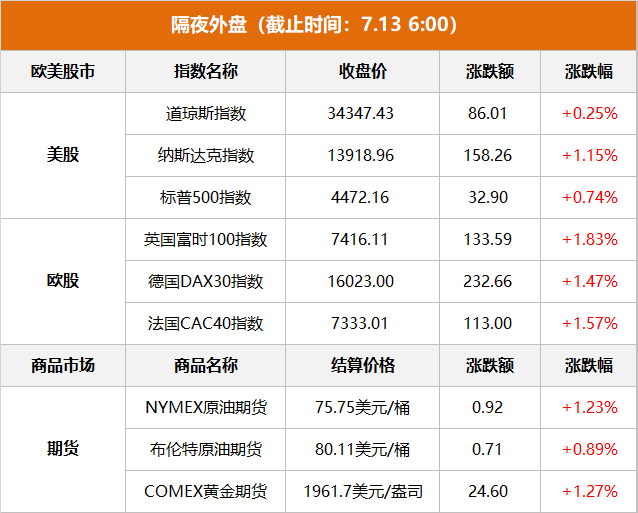 1、央视网:国务院总理李强主持召开平台企业座谈会,听取对更好促进平台经济规范健康持续发展的意见建议。座谈会上,美团、小红书、海智在线、货拉拉、阿里云、徐工汉云、抖音、智联招聘等企业负责人先后发言,拼多多、京东、欧冶云商、BOSS直聘、航天云网、卡奥斯等企业负责人提交了书面发言。 2、商务部:13部门研究制定了《全面推进城市一刻钟便民生活圈建设三年行动计划(2023-2025)》。目标到2025年,在全国有条件的地级以上城市全面推开,推动多种类型的一刻钟便民生活圈建设,形成一批布局合理、业态齐全,功能完善、服务优质,智慧高效、快捷便利,规范有序、商居和谐的便民生活圈,服务便利化、标准化、智慧化、品质化水平进一步提升,对恢复和扩大消费的支撑作用更加明显,居民综合满意度达到90%以上。 3、央视新闻:全国高校科技创新大会上,教育部负责人介绍,将着力提高基础研究组织化水平,有组织推进战略导向的体系化基础研究、前沿导向的探索性基础研究、市场导向的应用性基础研究,加快实现重大原始创新突破,为产业变革提供源头供给,全面加强有组织的科研攻关,进一步解决核心“卡脖子”重要问题。 4、市场监管总局:自2023年8月1日起对锂离子电池和电池组、移动电源实施CCC认证管理。自2024年8月1日起,未获得CCC认证证书和标注认证标志的,不得出厂、销售、进口或者在其他经营活动中使用。 5、界面新闻:美国6月CPI同比上升3%,连续12个月回落,预估为3.1%,前值为4.0%;6月CPI环比上升0.2%,预估为0.3%,前值为0.1%。美国6月核心CPI同比上升4.8%,预估为5.0%,前值为5.3%。