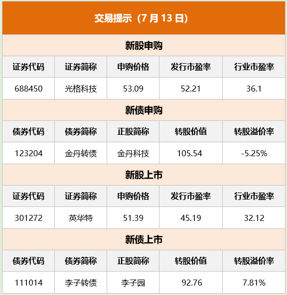 中炬高新:宝能系股东中山润田投资有限公司发布声明称,公司已于近期向中国证监会及广东监管局、上交所等各级党委政府实名举报中山火炬工业联合有限公司、中山火炬公有资产经营集团有限公司、上海鼎晖隽禺投资合伙企业(有限合伙)、嘉兴鼎晖桉邺股权投资合伙企业(有限合伙)、CypressCambo,L.P及中山火炬集团有限公司涉嫌虚假诉讼、操纵证券的重大犯罪行为。 康缘药业:披露两市首份半年报,公司上半年实现营业收入25.53亿元,同比增长21.74%;净利润2.76亿元,同比增长30.60%;基本每股收益0.47元。 中国电影:预计上半年归属于上市公司股东的净利润为28000万元到38000万元,与上年同期相比,将增加25981.43万元到35981.43万元,同比增加1287.12%到1782.52%。 闻泰科技:由于未披露一致行动关系,涉嫌信息披露违法,日前,闻泰科技控股股东闻天下科技集团有限公司及实际控制人张学政收到中国证监会《立案告知书》。上市公司方面人士表示,本次调查及相关事项不会对公司的日常运营造成重大影响;张学政近期一直在公司正常履职。 浙江世宝:公司控股股东浙江世宝控股集团有限公司于2023年7月11日、2023年7月12日通过大宗交易合计减持本公司9,786,400股A股股票,占其持有本公司股票数量的3.21%,占本公司总股本的1.24%。除此之外,公司控股股东、实际控制人在公司股票交易异常波动期间未买卖公司股票。 大连热电:预计2023年半年度实现净利润为亏损1亿元-1.2亿元。业绩预亏的主要原因,一是因售电量下降导致电收入同比减少;二是因耗煤量增加导致煤成本增加;三是因在建工程结转固定资产停止资本化利息,导致财务费用同比增加。 众泰汽车:初步预计2023年上半年净利润为负值,但尚未统计出具体数字;公司控股股东及实控人正在筹划变更公司实控人事宜,筹划变更实控人事宜何时完成及最终能否完成尚存在不确定性。此外,公司决定终止2022年度向特定对象发行A股股票事项,并向深交所申请撤回相关申请文件。 杰瑞股份:公司董事长李慧涛、总裁李志勇、副总裁路伟计划自7月13日起4个月内,以集中竞价方式增持公司股票,增持金额合计不低于800万元且不超过900万元。此次增持计划不设价格区间。 领益智造:预计上半年净利润10亿元-13亿元,同比增长107.75%-170.07%。报告期内,公司在汽车及光伏储能业务方面持续布局、扩大产能,实现较快增长。 钧达股份:预计2023上半年净利润9亿元-11亿元,同比增长230%-300%。报告期内,公司滁州二期年产10GW、淮安一期年产13GW项目投产,N型TOPCon产能规模提升,实现经营业绩大幅增长;公司电池片出货量为11.4GW,同比增长181%。 高测股份:建湖(二期)12GW光伏大硅片项目按照计划顺利推进,目前厂房基础设施已基本完成,预计三季度设备进场、安装调试并逐步释放产能。