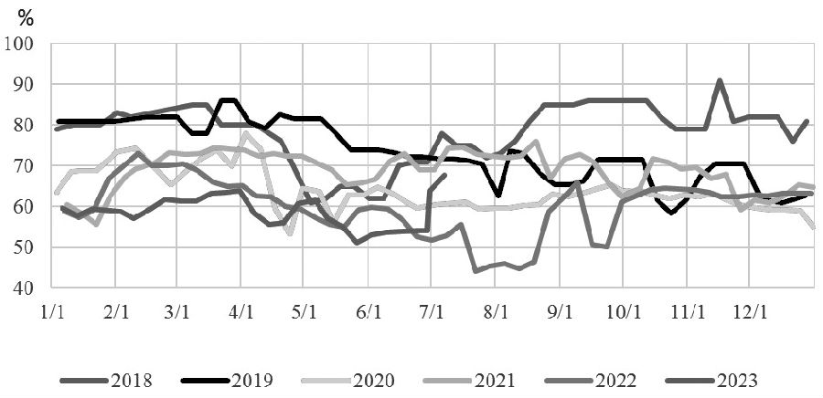 图为乙二醇华东地区库存合计 宏观方面,美国6月CPI同比增速超预期回落至3%,前值为4%,为2021年3月以来最小增幅。核心CPI同比增长4.8%,为2021年11月以来新低,季调环比增速从此前的0.4%回落至0.2%。由此可见,不管是CPI还是核心CPI均显示美国通胀回落的积极趋势。 从成本端来看,OPEC+兑现减产,俄罗斯原油产出也出现下滑迹象,并且首次突破了七国集团设定的60美元/桶的价格上限。截至7月7日,美国当周EIA原油库存594.6万桶,战略石油储备库存减少40.1万桶,为1983年8月19日当周以来最低。在美国通胀放缓和供应收紧的双重作用下,油价小幅回升,与此同时,石脑油、煤炭、甲醇价格同步上行,其中煤价由于日耗增加且库存维稳明显回升,成为近期煤化工品种的最大支撑。整体来看,乙二醇成本端价格目前均较为稳定。