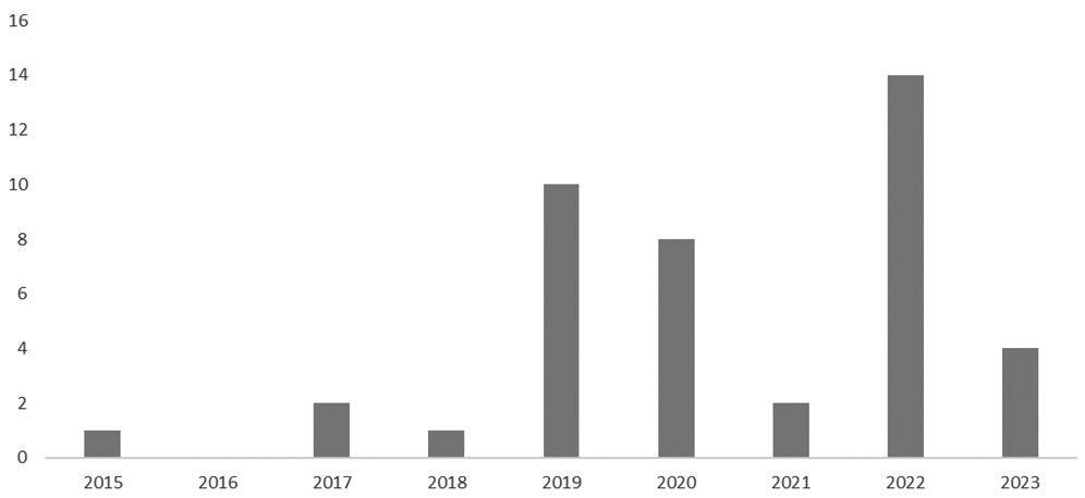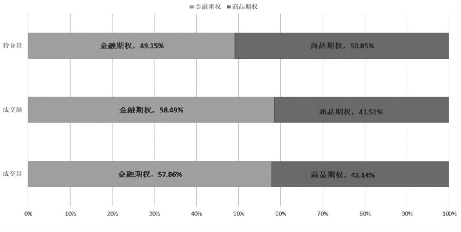 图为国内期权品种上市数目 2023年上半年美联储持续加息,全球经济增长乏力,海外衰退预期较大,国内经济则处于弱复苏阶段,整体宏观环境较为复杂。国内股市整体低迷,大宗商品大面积下跌,期权凭借非线性特性较好地实现对冲保值以及平滑利润的功能,成交、持仓规模实现了稳步增长。Wind数据显示,2023年上半年商品期权和金融期权合计成交量为107624万手,其中金融期权成交量为62273万手,占比58%,商品期权成交量为45351万手,占比42%;成交额6887亿元,其中,金融期权成交额为4028亿,占比58%,商品期权成交额为2859亿元,占比42%;6月底持仓量为1299万手,其中,金融期权6月末持仓量为638万手,占比49%,商品期权6月末持仓量为661万手,占比51%。值得一提的是,我国商品期权在成交量、持仓量、成交额方面的市场占比逐年递增。预计未来商品期权市场仍将维持快速增长。