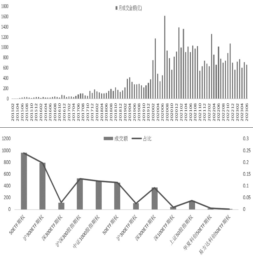 图为2023年上半年我国金融和商品期权交投对比 [金融期权市场稳健增长] 当前我国金融期权市场共有12个品种:3个股指期权及9个ETF期权。近两年交投规模整体呈现稳健增长态势,但今年以来股市表现不佳,期权市场交投也出现明显回落。截至2023年6月底,国内股票股指期权市场上半年总成交量累计达到62273万张,同比持平;累计成交额达到4028亿元,同比减少21%;6月底总持仓量达到638多万张,同比增加21%。