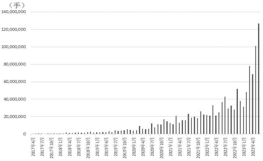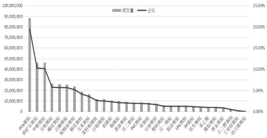 表为2023年上半年商品期权成交情况及排序(单位:手、亿元) 成交量 2023年上半年商品期权市场总成交量累计达到45351万张,同比增长约185%。2023年上半年商品期权成交量同比放大主要是我国期权品种上市速度加快,新品种带来的期权成交量增速加快以及市场波动加大导致的。从各个品种来看,PTA期权成交量8832万手,占比达到19.5%,位列第一。铁矿石、甲醇分列二、三位,成交量分别为4638万张和4628万张。