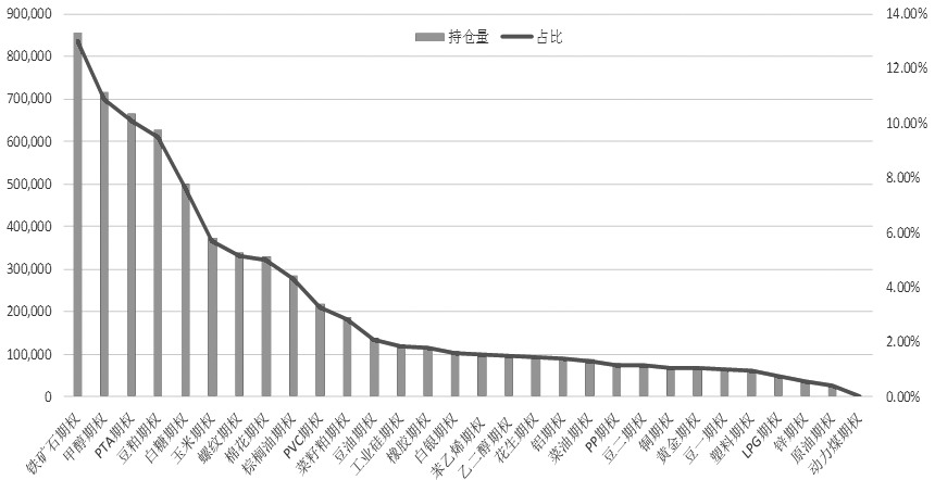 图为我国商品期权成交额情况 持仓量 2023年6月底总持仓量661多万张,同比增加90%左右。从各个品种来看,铁矿石期权持仓量86万张,占比达到13%,位列第一。甲醇、PTA期权分列二、三位,持仓量分别为72万张和67万张。
