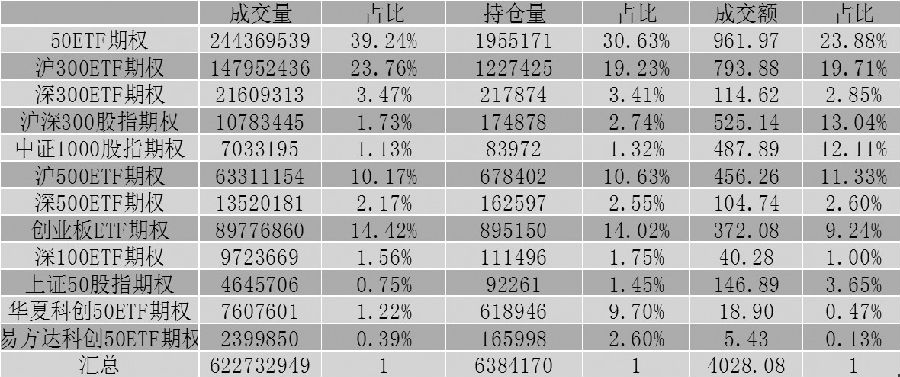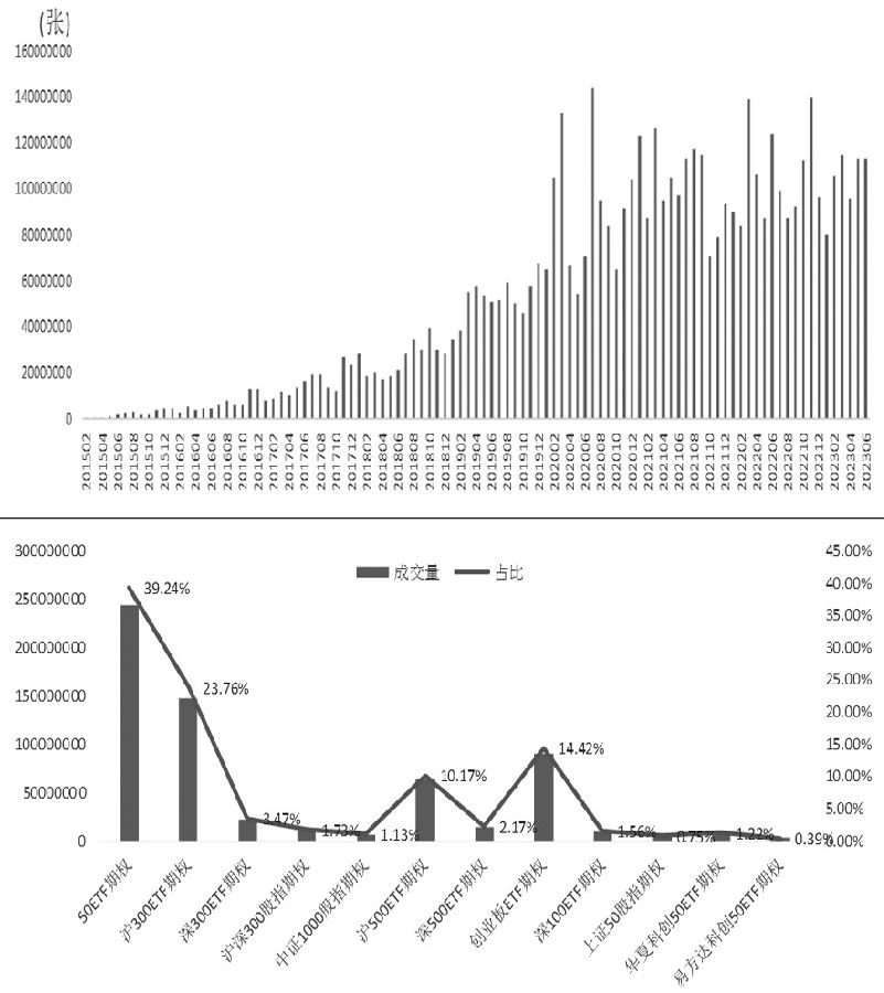 表为2023年上半年股票期权成交情况及排序(单位:张、亿元) 成交量 2023年上半年总成交量累计达到62273万张,同比持平。其中50ETF期权仍是投资者最为喜爱的交易品种,占整个市场总成交比例的39%。沪300ETF期权成交量占比也有24%。创业板ETF期权成交量占比14%。沪500ETF期权成交量占比10%。