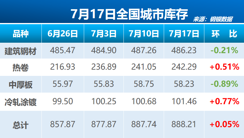 据钢银电商数据显示,截至7月17日,全国钢市总库存量为888.21万吨,较上周环比增加0.47万吨(+0.05%),包含39个城市,共计146个仓库。 本周建筑钢材库存总量为486.23万吨,较上周环比减少1.03万吨(-0.21%),包含30个城市,共计85个仓库。 本周热卷库存总量为242.29万吨,较上周环比增加1.24万吨(+0.51%),包含16个城市,共计50个仓库。 本周中厚板库存总量为58.23万吨,较上周环比减少0.52万吨(-0.89%),包含9个城市,共计15个仓库。 本周冷轧涂镀库存总量为101.46万吨,较上周环比增加0.78万吨(+0.77%),包含6个城市,共计15个仓库。 ![]() (文章来源:新华财经) (责任编辑:admin) |