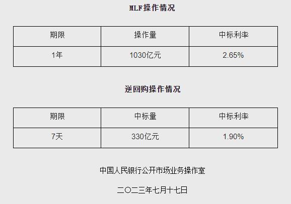央行开展1030亿元MLF和330亿元公开市场逆回购操作 央行网站 07月17日 为维护银行体系流动性合理充裕,2023年7月17日人民银行开展1030亿元中期借贷便利(MLF)操作和330亿元公开市场逆回购操作,充分满足了金融机构需求。具体情况如下:(文章来源:央行网站) (责任编辑:admin)