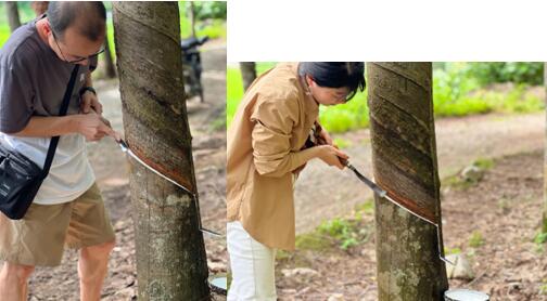前往胶林割胶,感受“乡村振兴”的成果 培训班成员们的脚步走到了云南勐醒农场的胶林,在全国割胶第七名能手的指导下,大家用一把把磨得锃亮的专业三角割胶刀从橡胶树上划过,橡胶树就出现斜斜的伤口,白白浓稠的橡胶汁液潺潺涌出,收获满满体验的同时也感受到了割胶的不易。